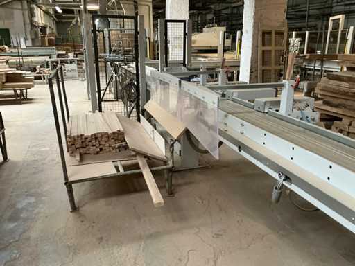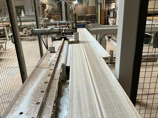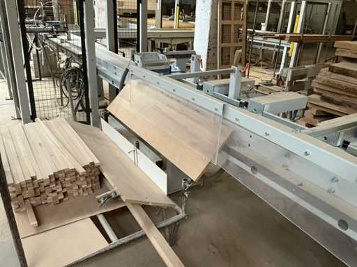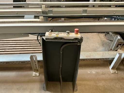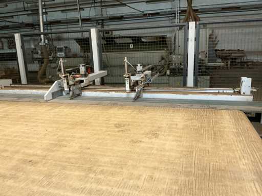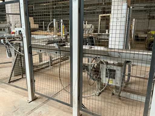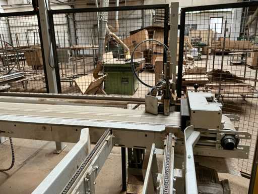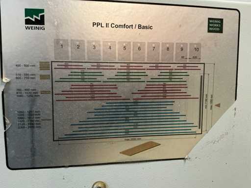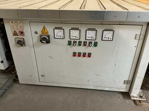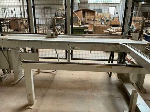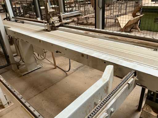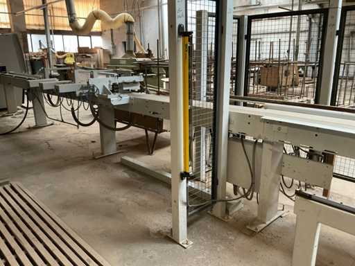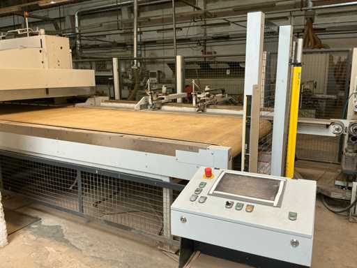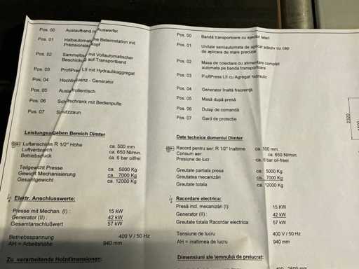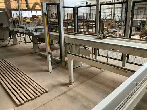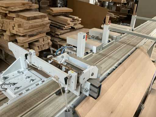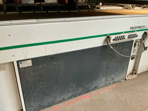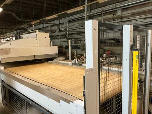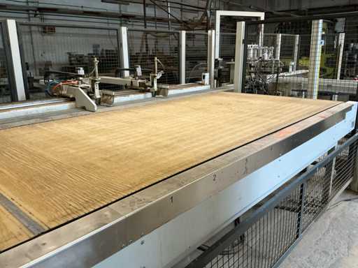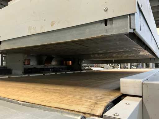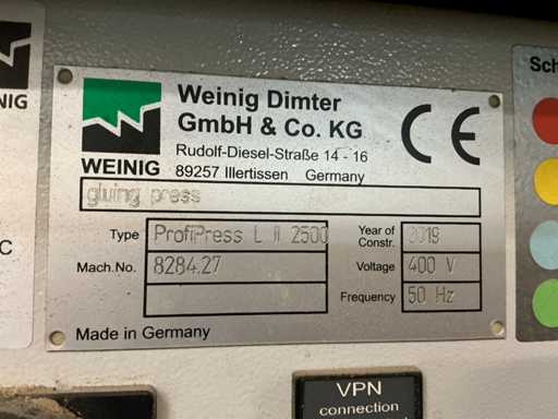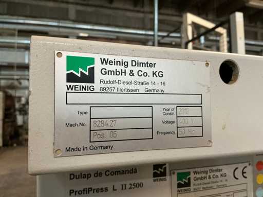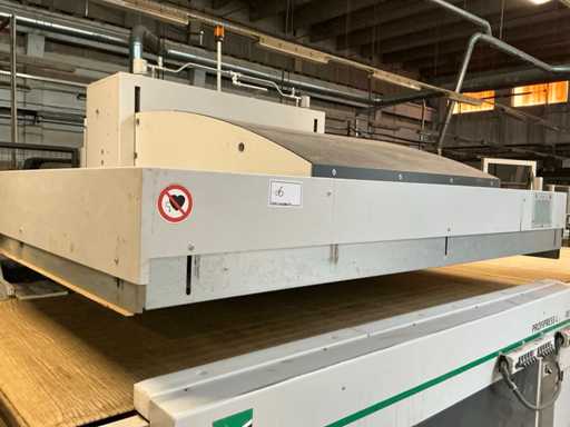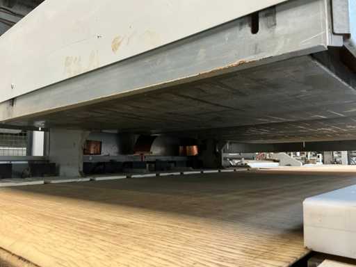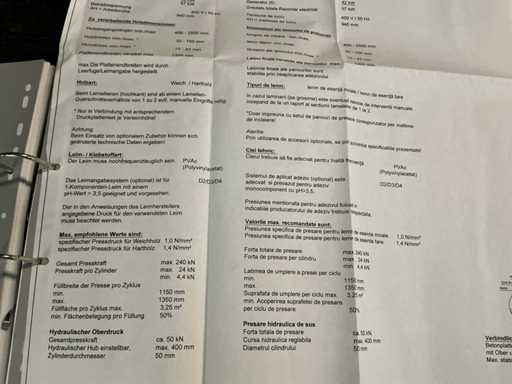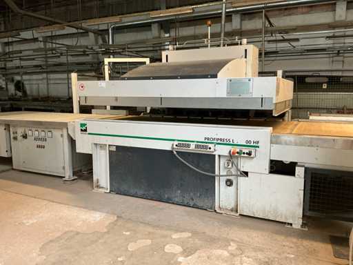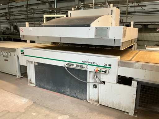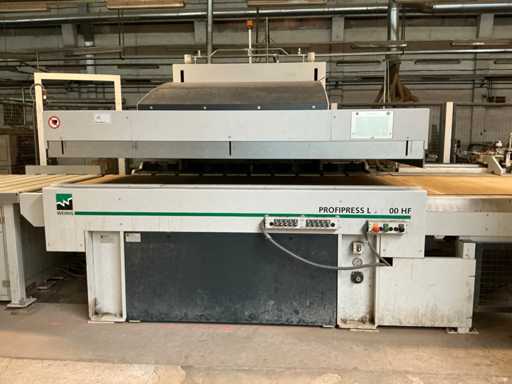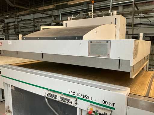 Osservazioni / dotazioni aggiuntive: Pressa per incollaggio ad alta frequenza Weinig Dimter ProfiPress L II 2500 HF, progettata per la giunzione industriale di lamelle e pannelli. Include unità idraulica, generatore HF, armadio di controllo, nastri di ingresso/uscita e custodia di sicurezza. Adatto per applicazioni su legno tenero e duro, con applicazione automatica dell'adesivo e controllo del ciclo di pressatura. Prodotto in Germania, anno di costruzione 2019.