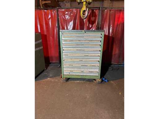 Descrizione: Armadio in metallo industriale con cassetti contenenti una vasta gamma di utensili per la lavorazione lavorativa.