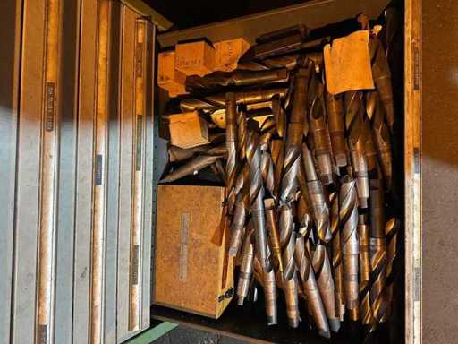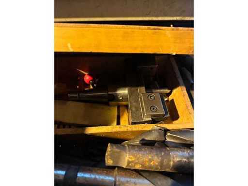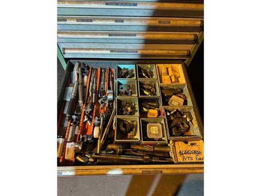 Il contenuto include, ma non si limita a: varie fresatorie, trapani di grande diametro, alberi/portautensili e vari utensili da taglio e accessori per officina (distribuiti in diversi cassetti, come mostrato nelle foto).