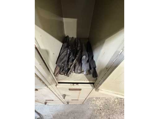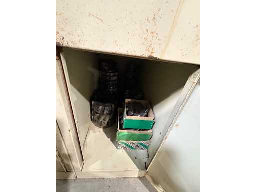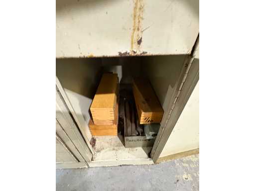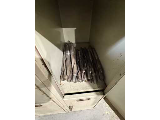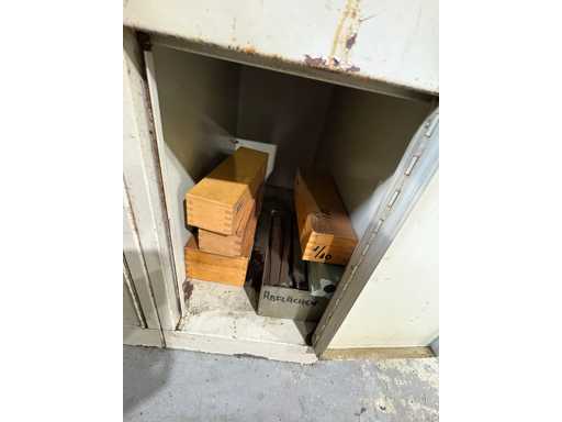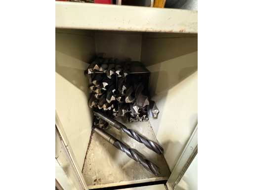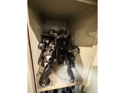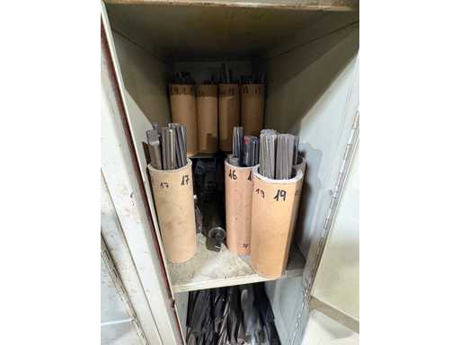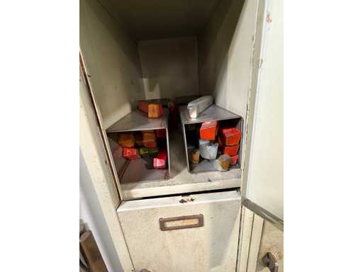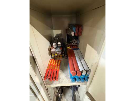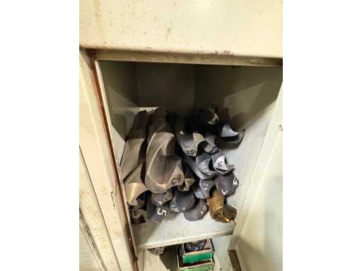 Armadio portautensili con frese, punte elicoidali, acciai da tornitura e strumenti di misurazione
