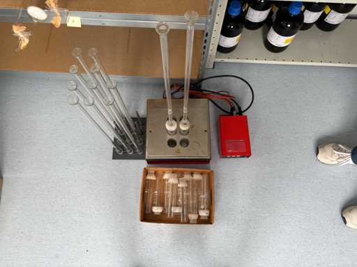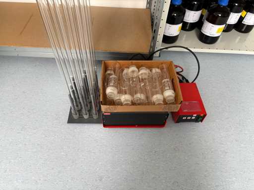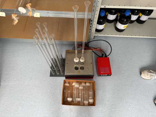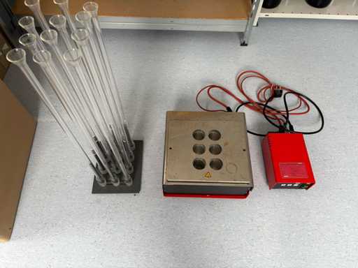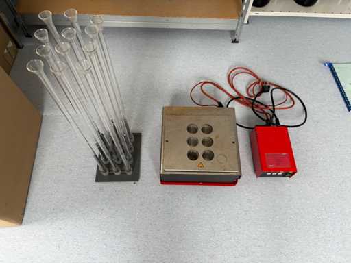I contenitori di reazione associati e i tubi di vetro sono presenti e otticamente intatti. Chiusure e tagli non mostrano danni riconoscibili. Il cavo e l'alimentatore sono completi e intatti.