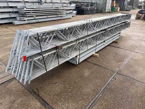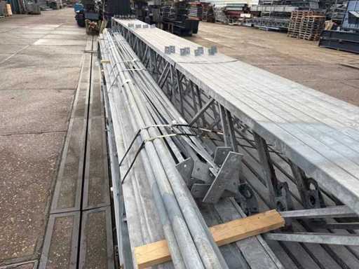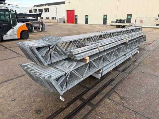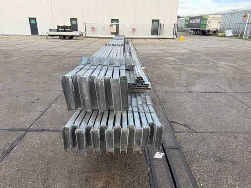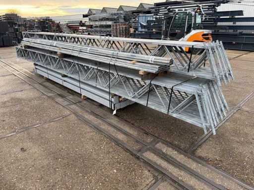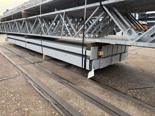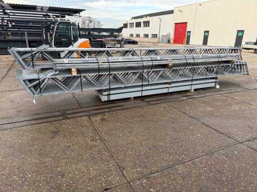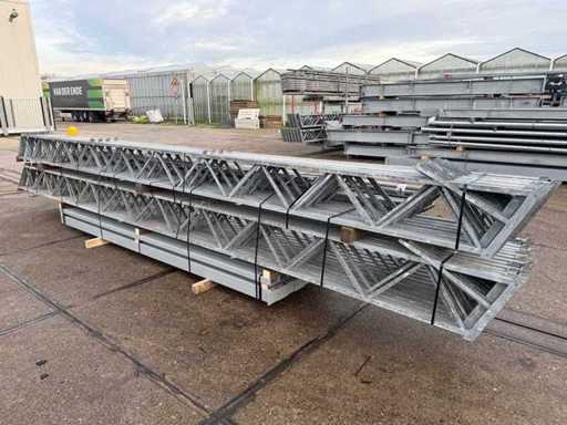 Apertura della barra di direzione tra le travi; travi C.O.H. 4000mm; sezione a scatola come montanti e caprici a griglia; trafilatura in acciaio; disegno 3D; pendenza del tetto di 25 gradi; 11 set di travi intermedie; dotato di tiranti con strisce di sospensione; rinforzi e contropole; il parcheggio è ordinatamente pronto per il trasporto e deve essere prelevato con 1 rimorchio; Il lotto è caricato gratuitamente con un carrello elevatore
