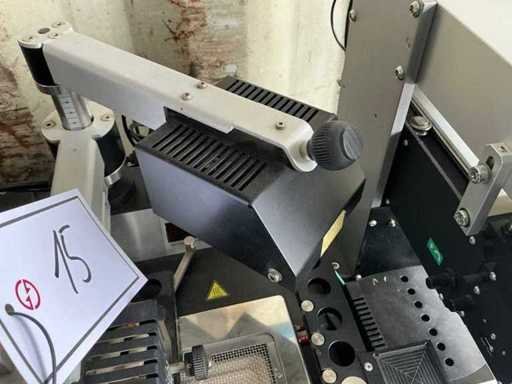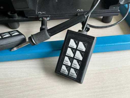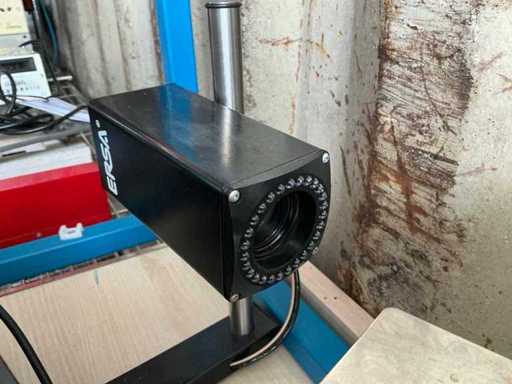 Braccio articolato regolabile con modulo ottico/fotocamera montato e sistema di illuminazione per l'allineamento dei componenti.