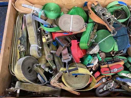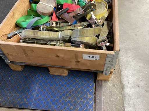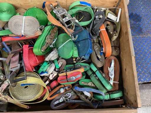 Un lotto misto di cinghie di tensione di varie lunghezze e spessori da 2,5 a 11,5 metri, con pallet in cambio