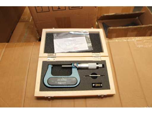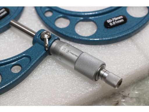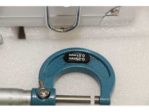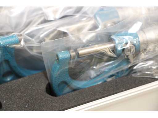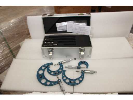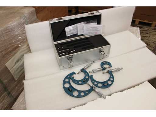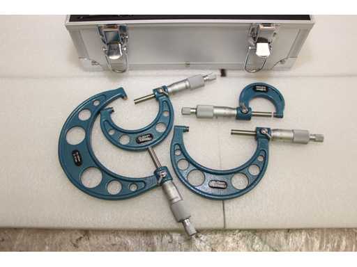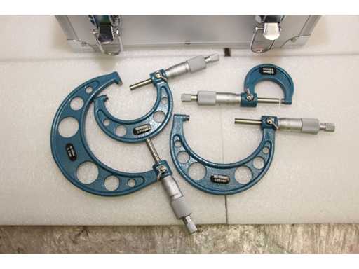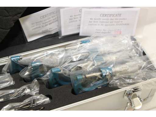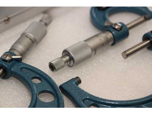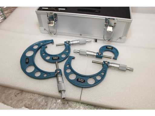 Set composto da 4 micrometri centesimali per misurazioni da 0 a 100 mm. Misure: 0-25mm; 25-50mm; 50-75mm; 75-100mm. Certificato incluso