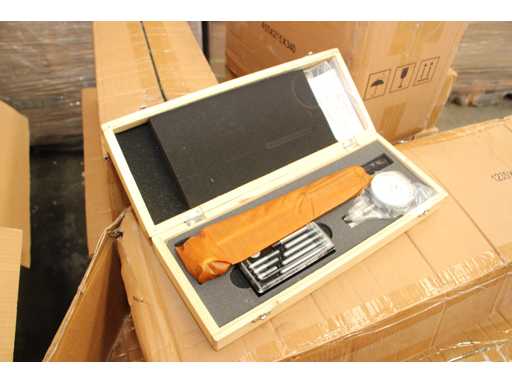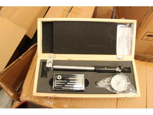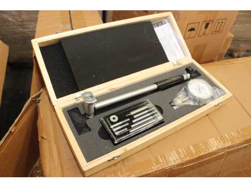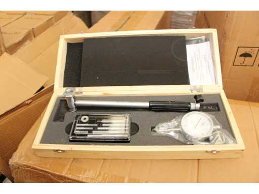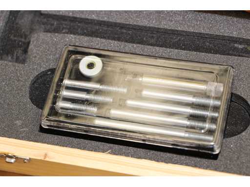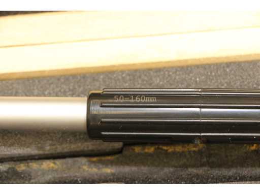 Calibro di calibro di precisione con due punti di contatto, con elementi elastici per il centraggio. Costruzione leggera e robusta con elementi CFRP per una minore espansione termica e una maggiore protezione dalla corrosione. Manico sul supporto per meno influenze termiche. Trasmissione fluida e precisa della corsa della punta di contatto tramite un segmento curvo. I diversi punti di contatto con la sfera d'acciaio temprata fissa permettono di comporre i diversi ⌀ da misurare. Applicazione: Per misurazioni precise di ⌀, rotondità e cilindricità di fori e profili interni. In una scatola di legno. Autonomia: 50-160 mm, Profondità: 150 mm
