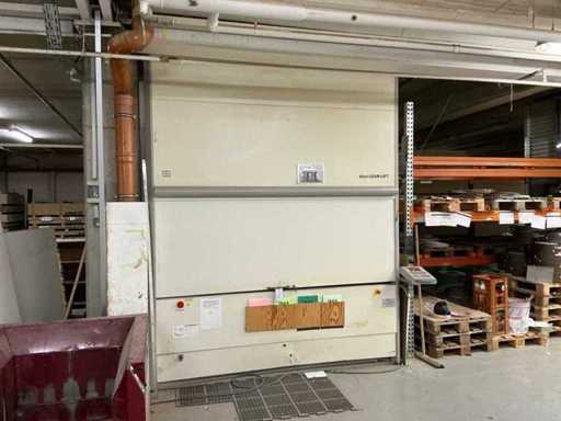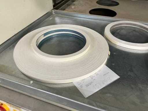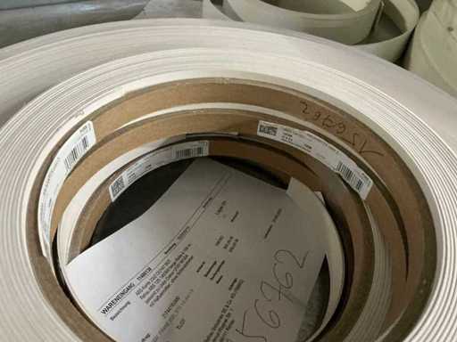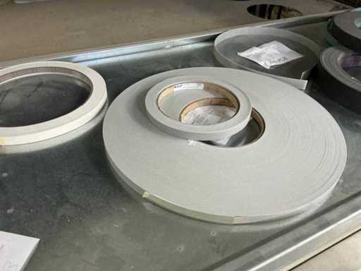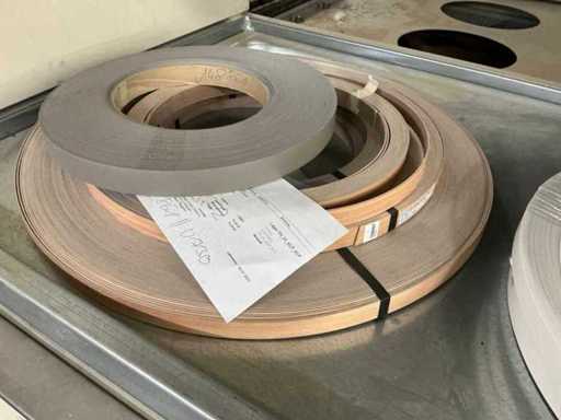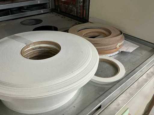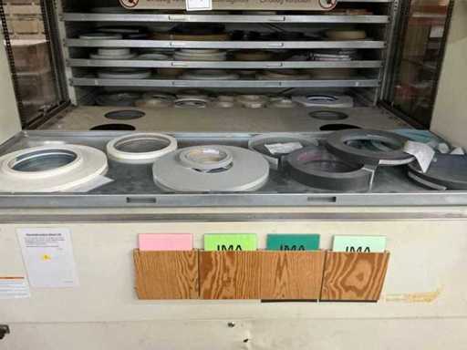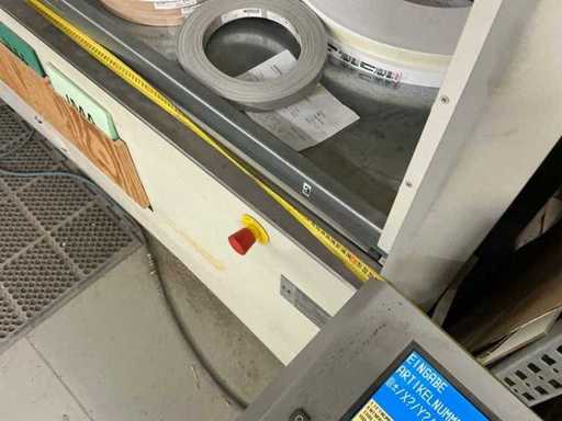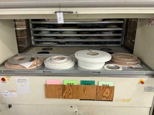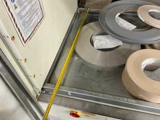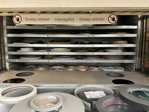 Carico massimo del contenitore: anteriore 450 kg, posteriore 450 kg, dimensioni: 2900 x 2900 x 3500 mm, contenuti: ampia selezione di materiali per bordi per macchine per lacciatura, spessori, dimensioni e qualità varie, circa 18-19 compartimenti occupati