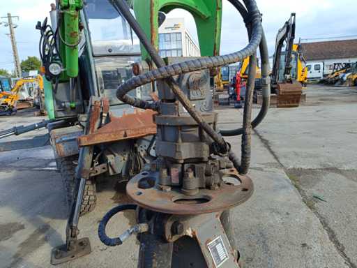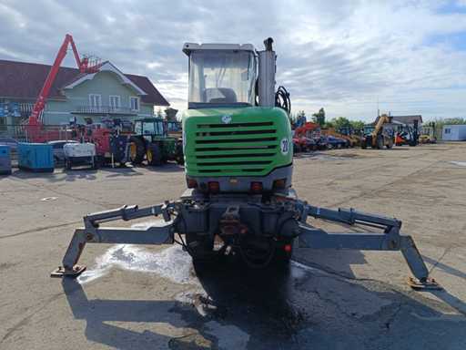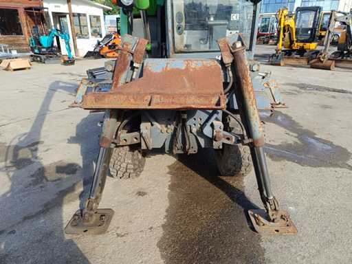 Escavatore compatto su ruote HANSA APZ 531 in condizioni operative. Equipaggiato con un motore Deutz, 4 supporti idraulici e un attacco rotante a conchiglia. Ideale per lavori municipali, progetti di drenaggio e applicazioni di movimentazione materiali.