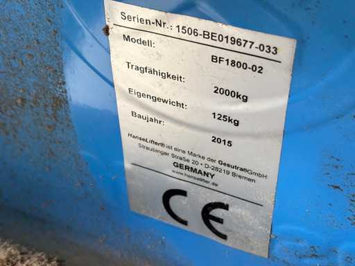 Macchina n. 1506-BE019677-033, capacità di carico circa 2000 kg, lunghezza della forcella circa 1790 mm (L'articolo è in condizioni esistenti e non controllate. L'articolo è venduto dalla fondazione e senza contenuti o materiali!)