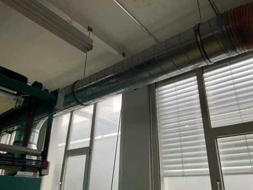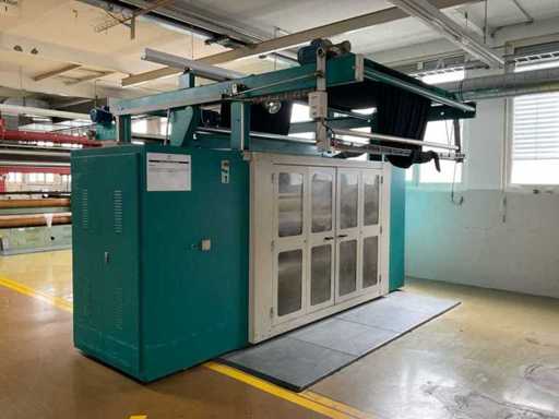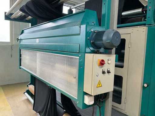 con supporto a bobina, larghezza di lavoro di circa 2200 mm, schermo centrale di controllo integrato con mobile elettrico a 2 porte e filtro a sacchi a 2 pieghe installati con tubazioni combinate, spazio totale apportato. 4000 x 5500 mm, numero di riferimento #10575
