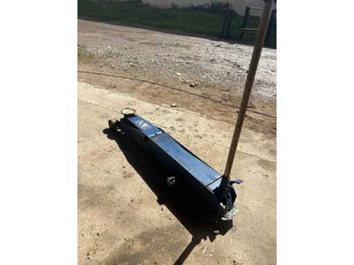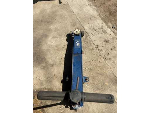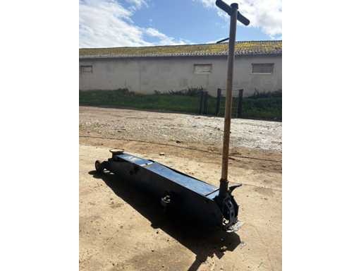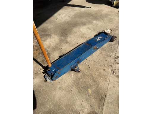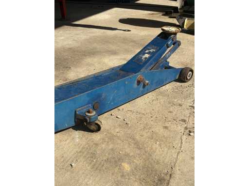Martinetto idraulico da officina progettato per il sollevamento di veicoli o attrezzature pesanti. Struttura in acciaio per impieghi gravosi con quattro ruote e comando a leva.