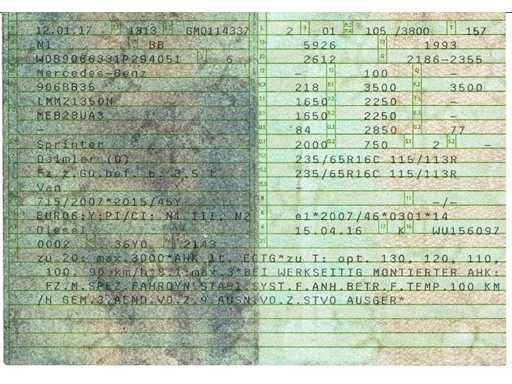 Graffi/schegge di pietra e segni di uso. I danni da incidente sulla destra, inclusa la porta scorrevole premuta, possono essere aperti solo dall'interno! Ab. II. No.WU156097. Schegge di pietra sul parabrezza, rivestimento del sedile del guidatore, guancia danneggiata. Tracce di rimozione all'interno