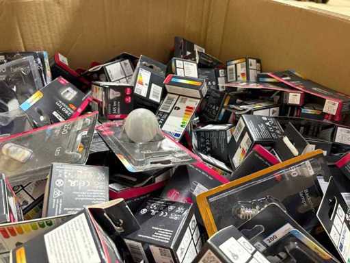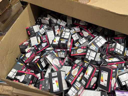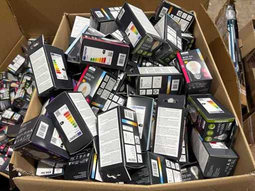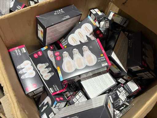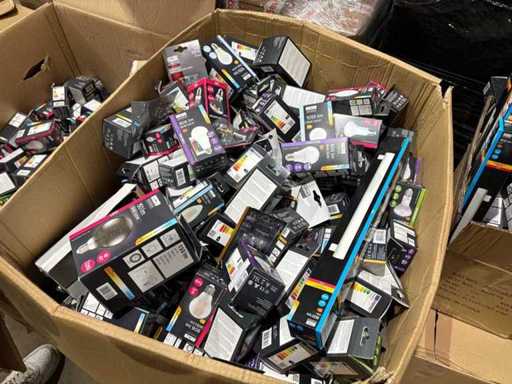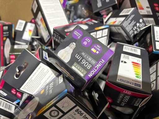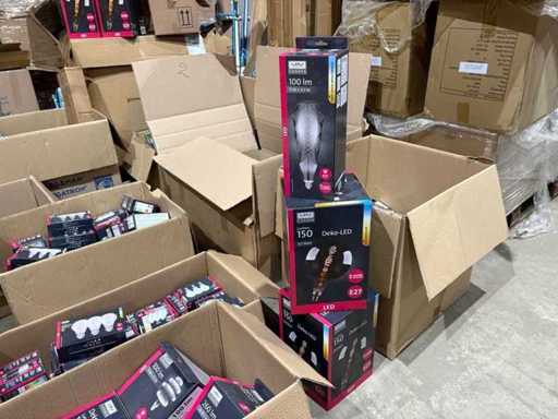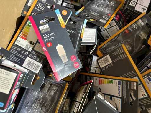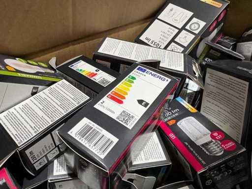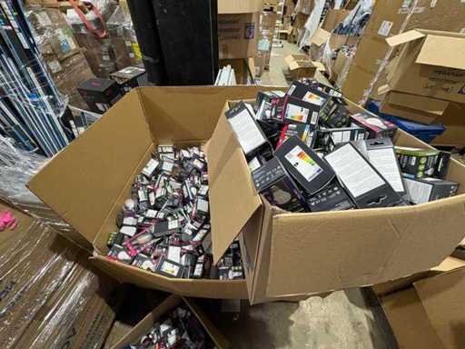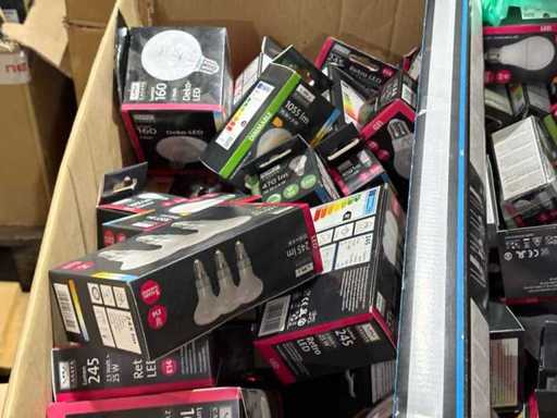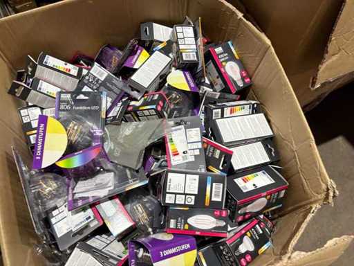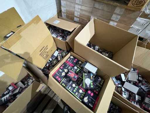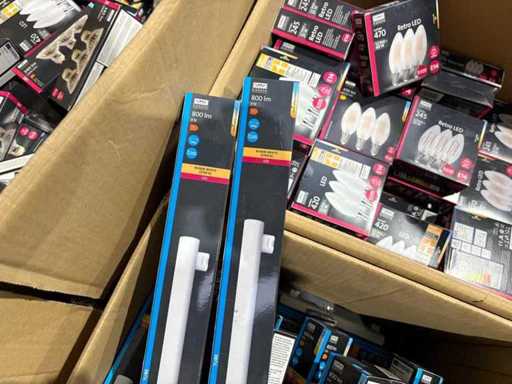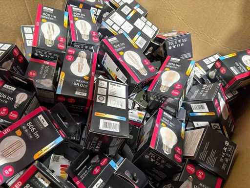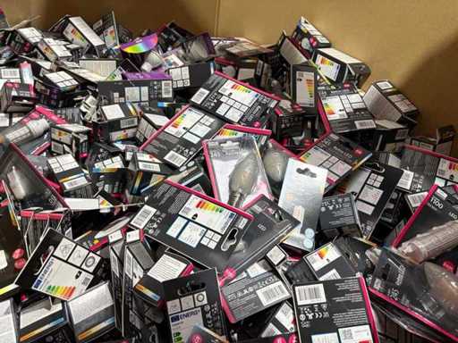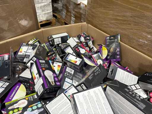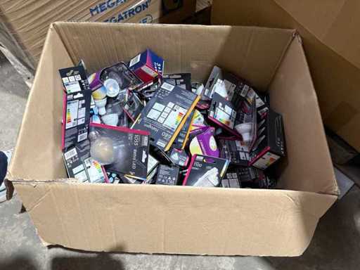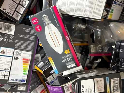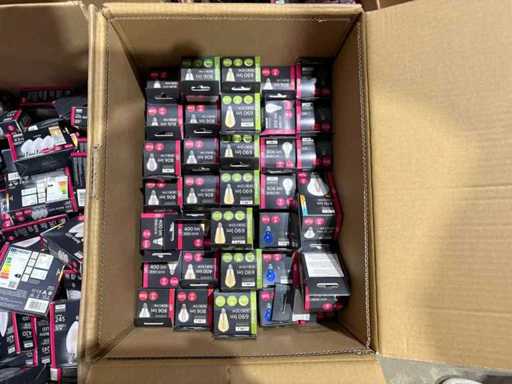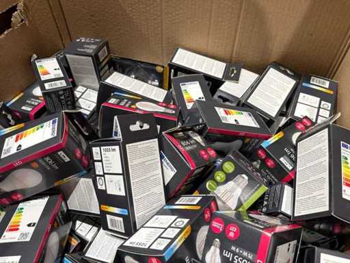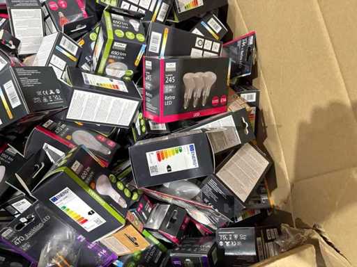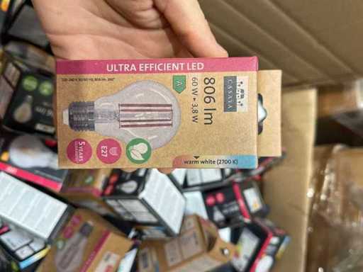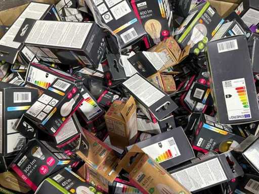 I beni offerti sono in forma di conservazione mista in grandi scatole. Non c'è smistamento né rifornimento palletizzato. Le scatole contengono lampadine LED nuove di zecca e inutilizzate, alcune confezionate singolarmente, altre in confezioni multiple.