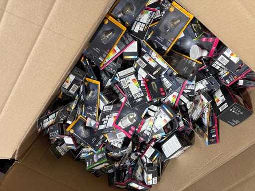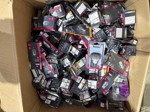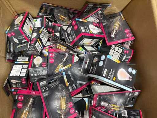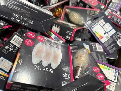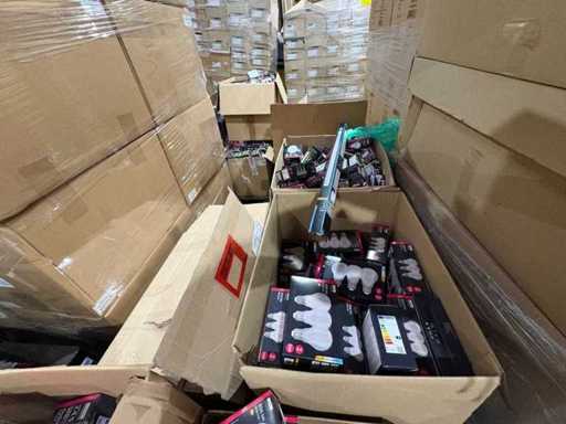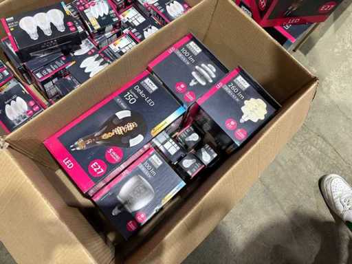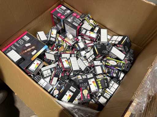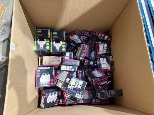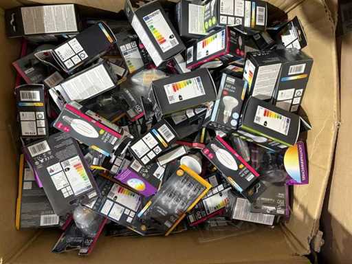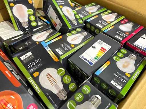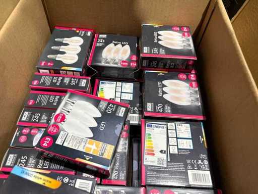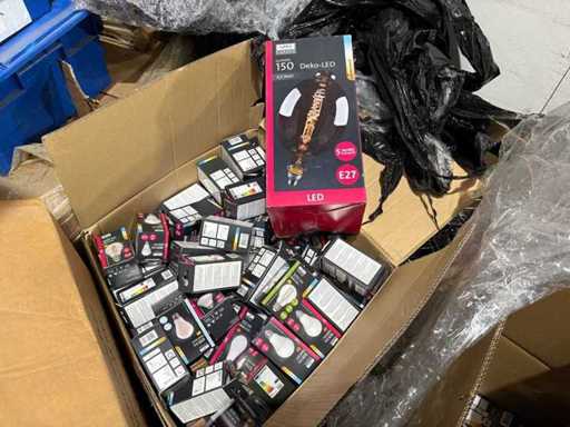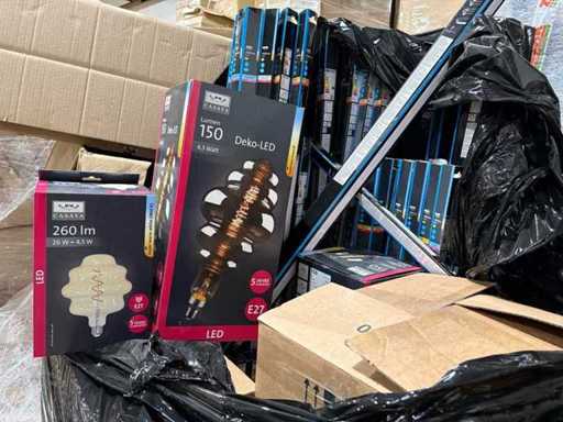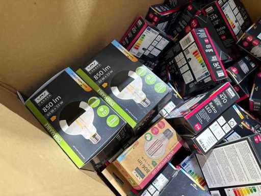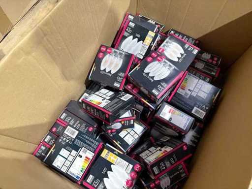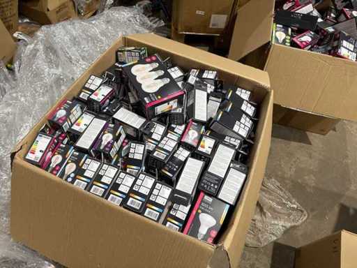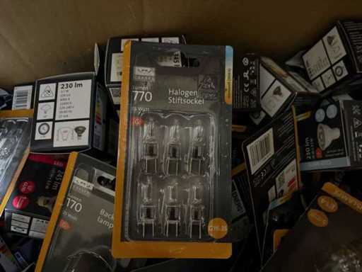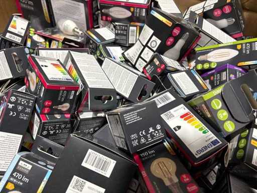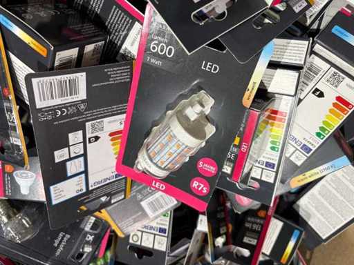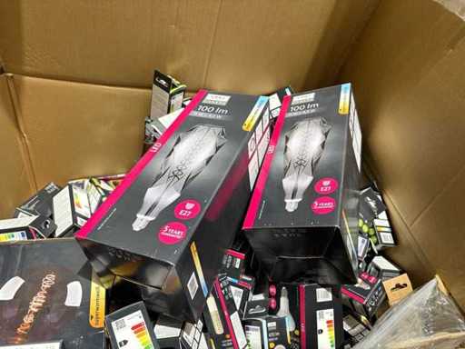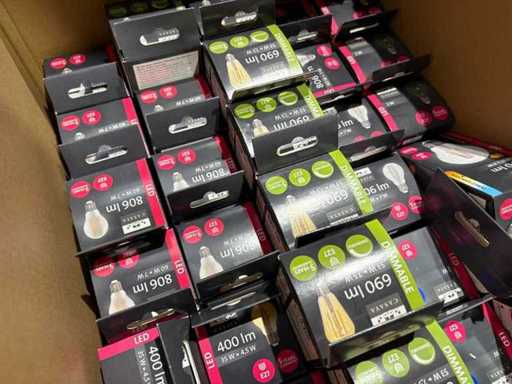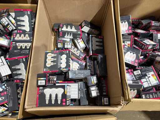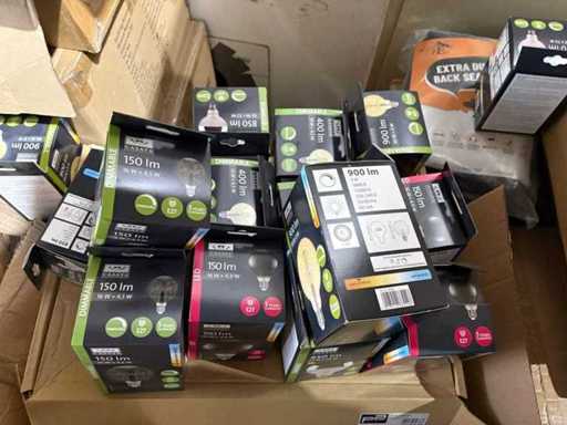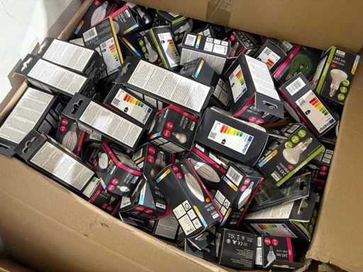 I beni offerti sono in forma di conservazione mista in grandi scatole. Non c'è smistamento né rifornimento palletizzato. Le scatole contengono lampadine LED nuove di zecca e inutilizzate, alcune confezionate singolarmente, altre in confezioni multiple.