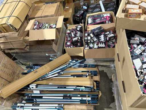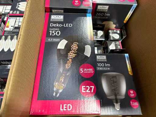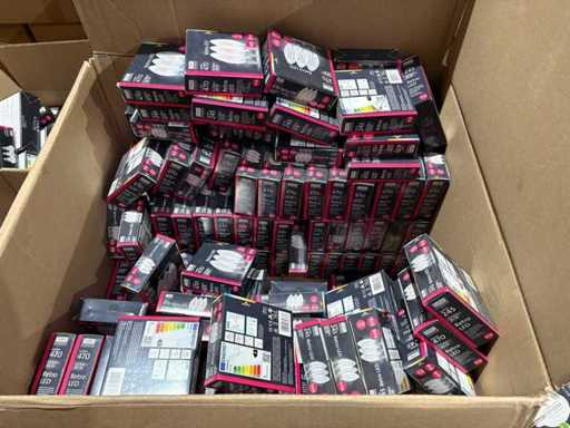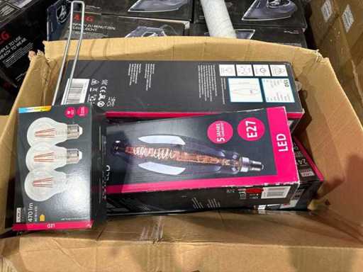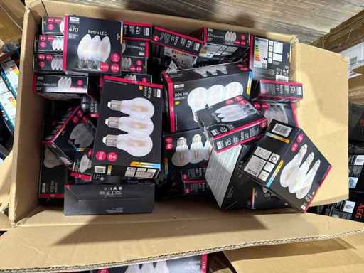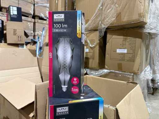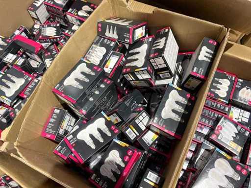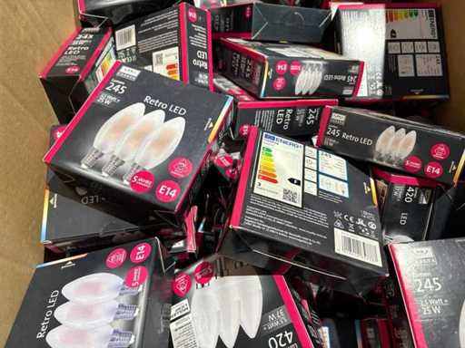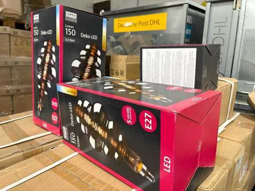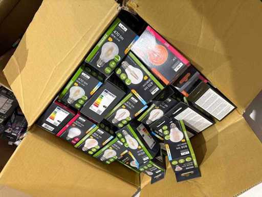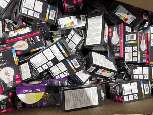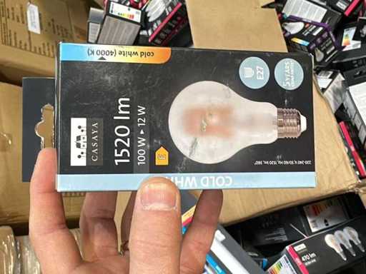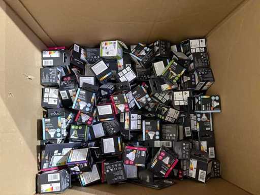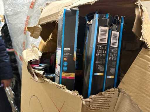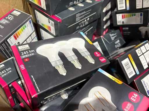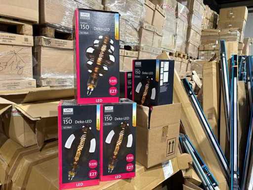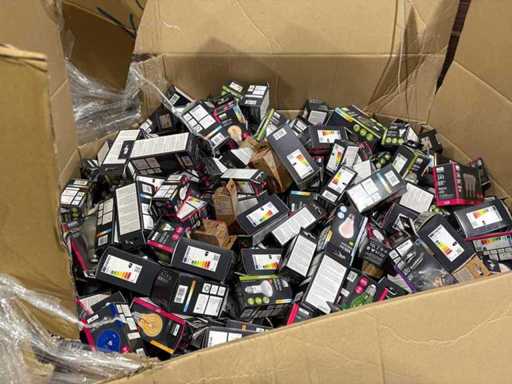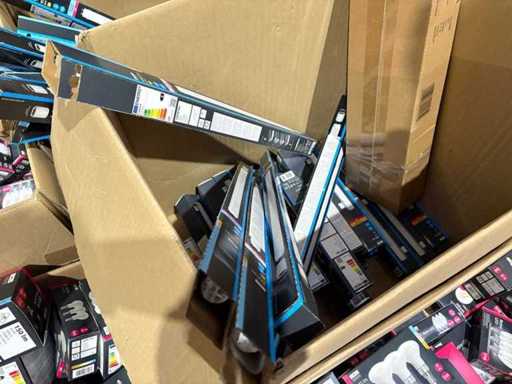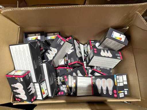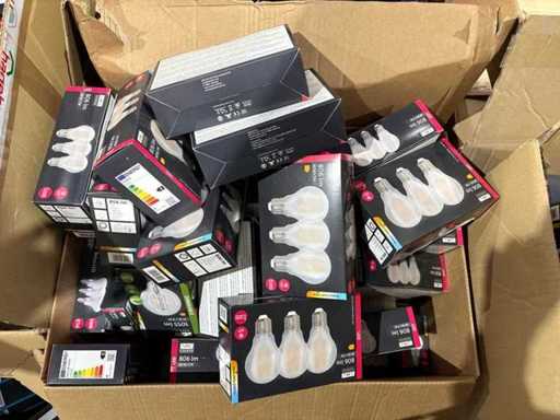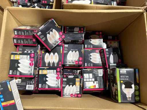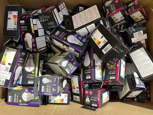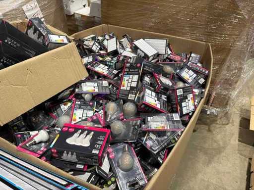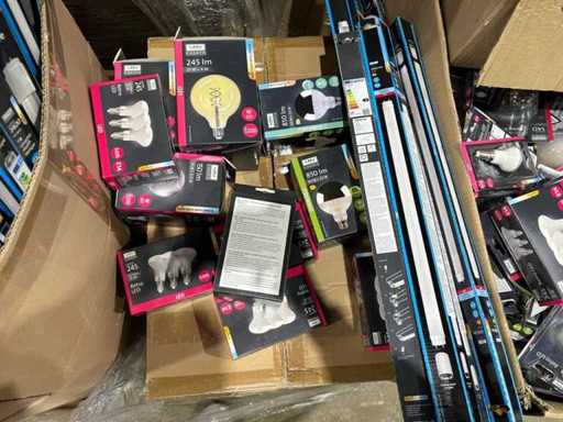 I beni offerti sono in forma di conservazione mista in grandi scatole. Non c'è smistamento né rifornimento palletizzato. Le scatole contengono lampadine LED nuove di zecca e inutilizzate, alcune confezionate singolarmente, altre in confezioni multiple.