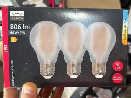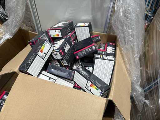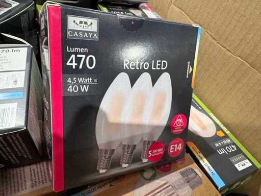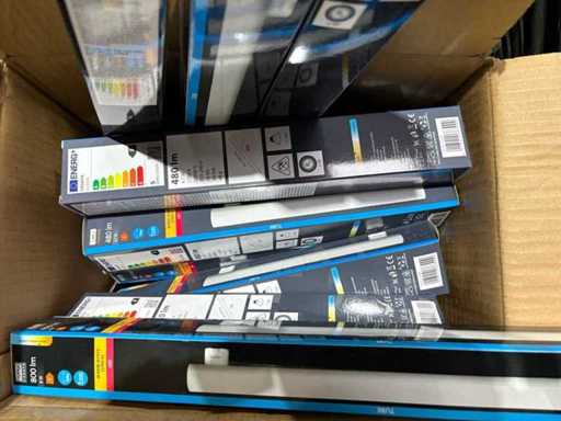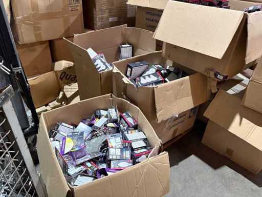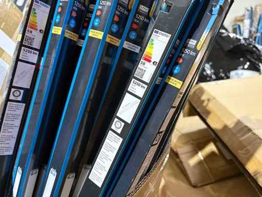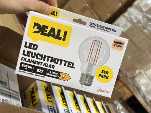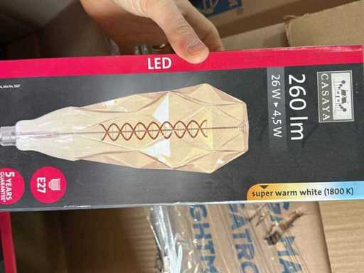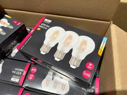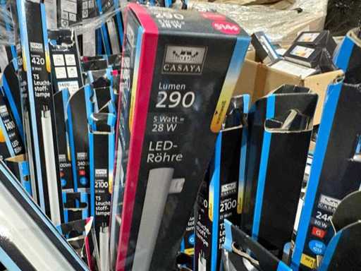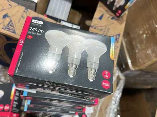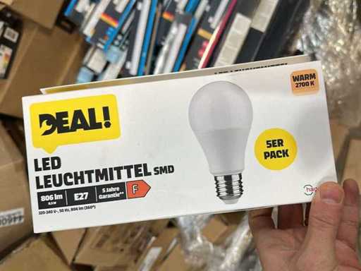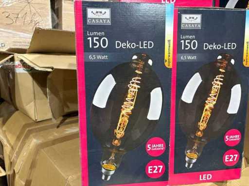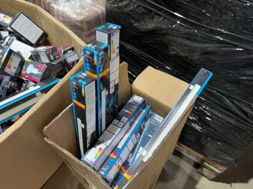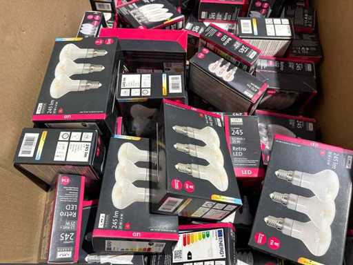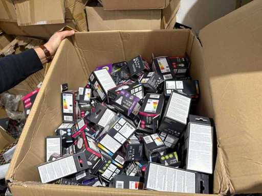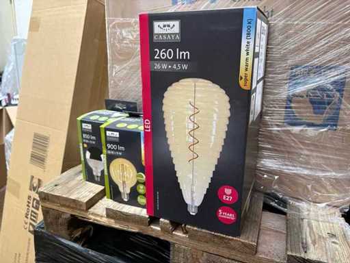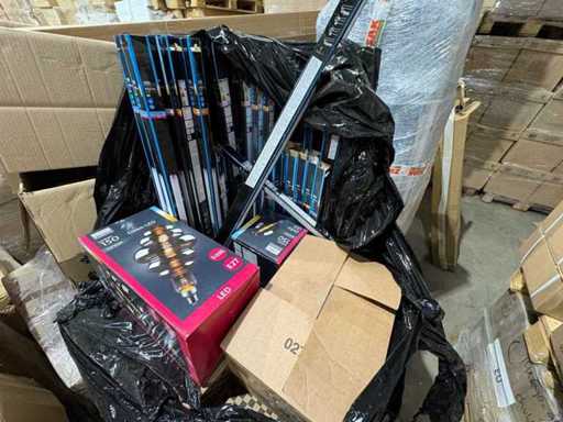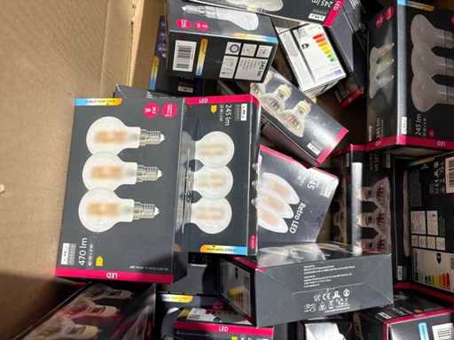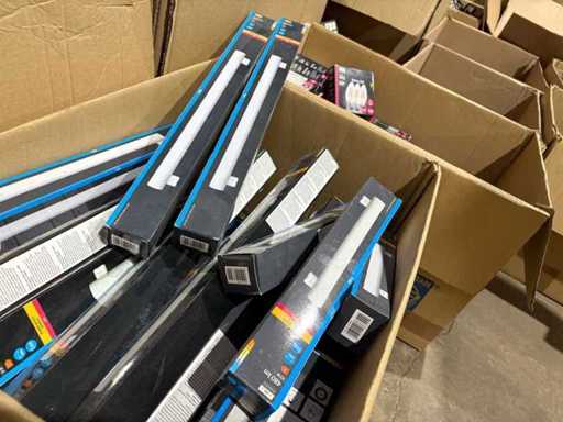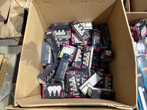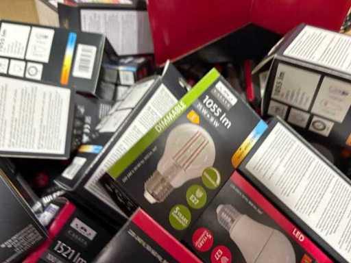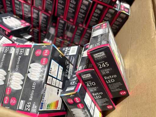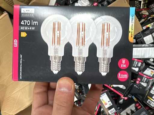 I beni offerti sono in forma di conservazione mista in grandi scatole. Non c'è smistamento né rifornimento palletizzato. Le scatole contengono lampadine LED nuove di zecca e inutilizzate, alcune confezionate singolarmente, altre in confezioni multiple.