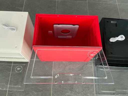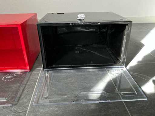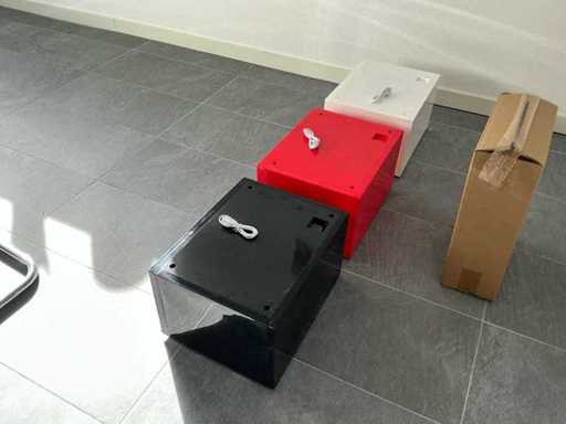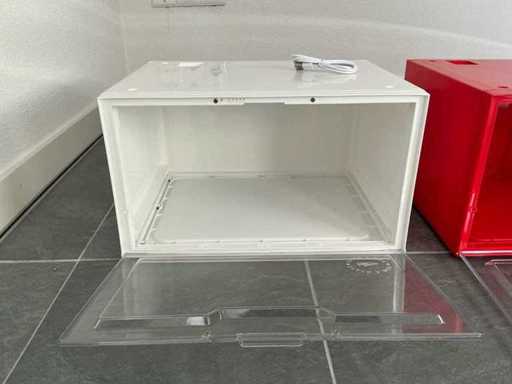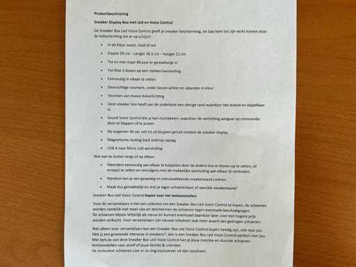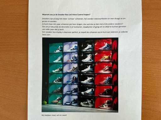 Equipaggiato con: 210 pezzi bianchi, 170 pezzi neri, 120 pezzi rossi. Illuminazione LED azionata tramite comando vocale. La scatola per esposizione per sneaker con LED e controllo vocale è una scatola impilabile in nero, rosso e bianco (29 x 36,5 x 21 cm) adatta fino alla misura 48, facile da assemblare e collegare (fino a 5 scatole in una sola connessione), con frontale trasparente, lati colorati, chiusura magnetica, bordo inferiore robusto e stabile, illuminazione LED con sensore acustico (risponde agli applausi o alle conversazioni, si spegne dopo ±60 secondi senza rumore), connessione USB-A a micro-USB e offre una conservazione e presentazione delle sneaker senza polvere, sicuro e elegante, ideale per i collezionisti che vogliono proteggere, esporre e mantenere o aumentare il valore delle scarpe.