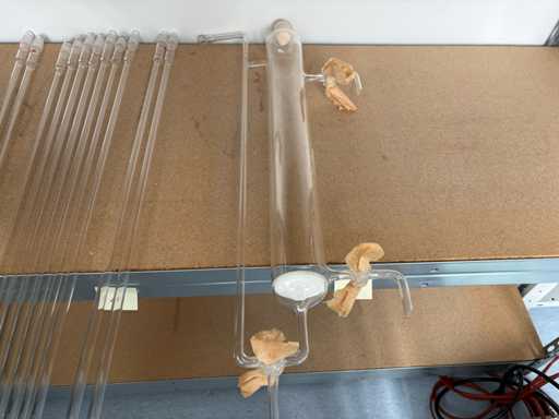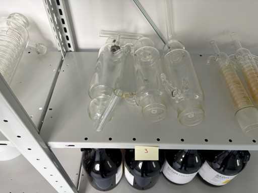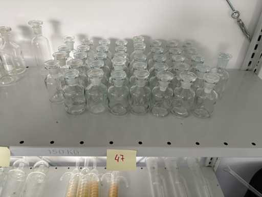 La collezione include vari oggetti in vetro in quantità diverse, come contrassegnati (ad esempio 1, 3, 4, 5, 6, 11, 47, 83 pezzi). Gli articoli includono recipienti Schott DURAN, refrigeratori, fiasche, bottiglie in vetro ambrato, tubi di vetro e altri recipienti da laboratorio. I tagli di vetro e i punti di attacco sembrano in gran parte intatti. Tuttavia, alcune parti presentano nodi o segni di usura legati all'età o all'uso, che di solito non influiscono sull'uso in laboratorio.