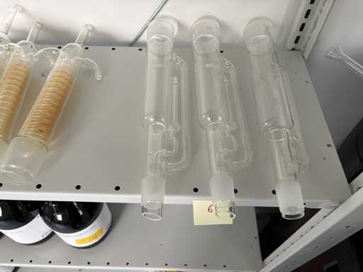 Il pacchetto di vetro da laboratorio è in condizioni complessive di uso e funzionale. Gli oggetti in vetro provengono da normali operazioni di laboratorio e di conseguenza mostrano i tipici segni di utilizzo. Questi includono lievi depositi, decolorazioni, residui o tracce di calcare, specialmente nel caso di bobine di raffreddamento e accessori di distillazione. La maggior parte delle parti appare visivamente intatta; Qualsiasi danno riconoscibile come sfalde, crepe o fratture non poteva essere rilevato durante l'ispezione visiva.