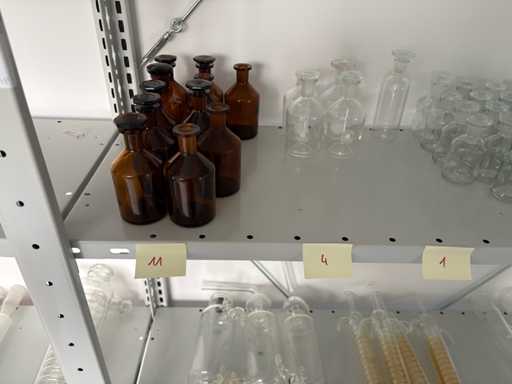 Ampia collezione di oggetti di vetro da laboratorio provenienti da un laboratorio analitico, composta da una vasta selezione di diversi apparecchi e recipienti in vetro. Il set include frigorifere, fiaschede, cilindri graduati, bottiglie in vetro ambrato, recipienti Schott DURAN e varie parti speciali in vetro. Gli elementi sono numerati o contrassegnati con quantità (ad esempio 1, 3, 4, 5, 6, 11, 47, ecc.) in modo che venga assegnata chiaramente una chiara assegnazione ai rispettivi gruppi.