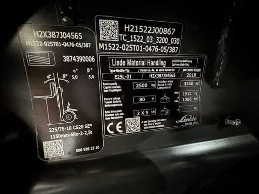 Servizio 2018 + UVV 02/2027 Linde E25L EVO 2.500kg 3.+4. Valvola 170cm Regolatore della forcella Triplex 476m Carrello elevatore elettrico 10.829 ore