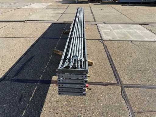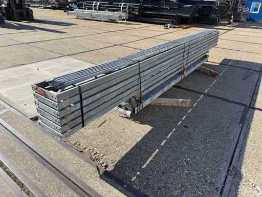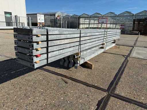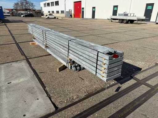 costruzione in acciaio con tetto piano; apertura libera; travi C.O.H. 4000mm; composto da 6 serie di travi a griglia con tubi come montanti; dotata di rinforzi per il vento e rinforzi trasversali; la costruzione in acciaio è pronta ordinatamente per il trasporto e deve essere ritirata con un rimorchio; I lotti vengono caricati gratuitamente con un carrello elevatore