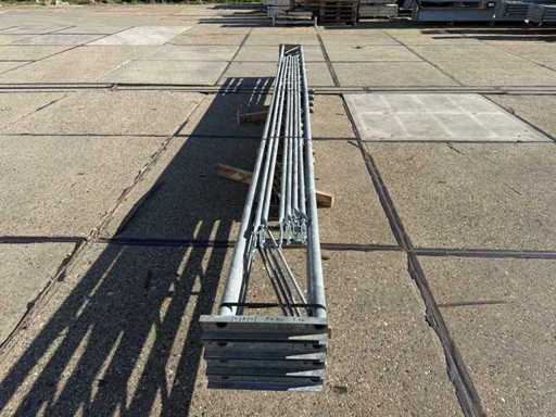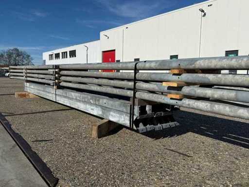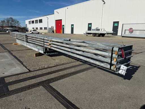 costruzione in acciaio con tetto piano; apertura libera; travi C.O.H. 4000mm; composto da 4 serie di travi a griglia con tubi come montanti; dotata di rinforzi per il vento e rinforzi trasversali; la costruzione in acciaio è pronta ordinatamente per il trasporto e deve essere ritirata con un rimorchio; I lotti vengono caricati gratuitamente con un carrello elevatore