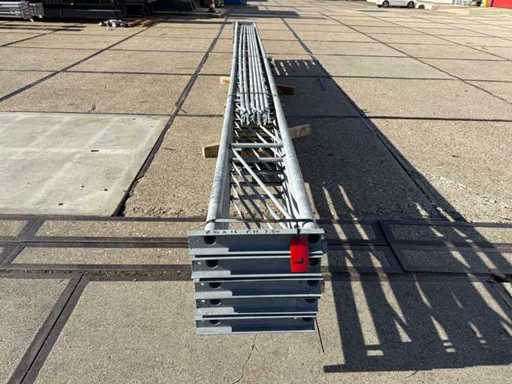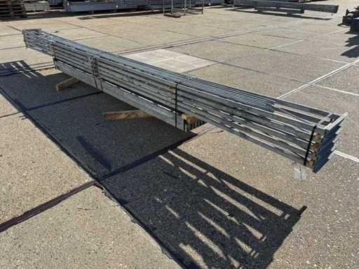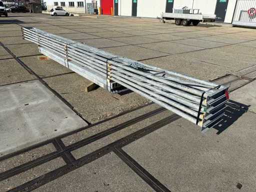 costruzione in acciaio con tetto piano; apertura libera; travi C.O.H. 4000mm; composto da 5 serie di travi a griglia con tubi come montanti; dotata di rinforzi per il vento e rinforzi trasversali; la costruzione in acciaio è pronta ordinatamente per il trasporto e deve essere ritirata con un rimorchio; I lotti vengono caricati gratuitamente con un carrello elevatore