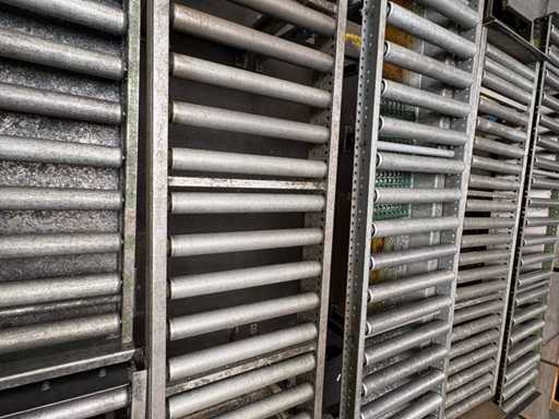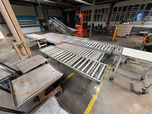 Diversi moduli di trasporto a rulli (rulli a gravità) in acciaio