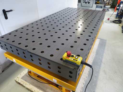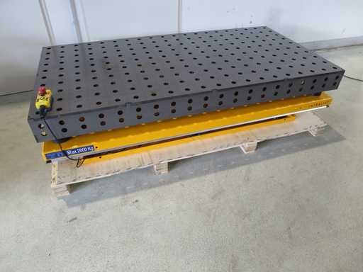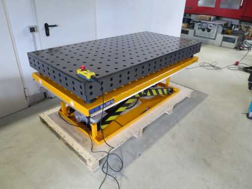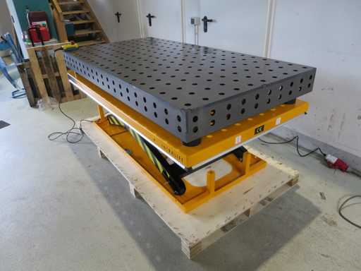Tavolo di saldatura su tavolo elevatore: Diametro del foro: 28 mm Il tavolo è realizzato in acciaio S355 di spessore 15mm La superficie è macchiata e oliata. Tolleranza: +/- 1 mm nella parte superiore e +/- 1 grado ai lati. Pareti laterali 150 x 10 mm Parte inferiore a coste per rinforzo. Lunghezza tavola 2000 mm Larghezza tavola 1000 mm Capacità di carico 2000 kg Altezza di sollevamento max. 1525 mm Potenza totale allacciata 1,5 kW Tensione di collegamento 400 V Condizione: mai usato / nuovo (5)
