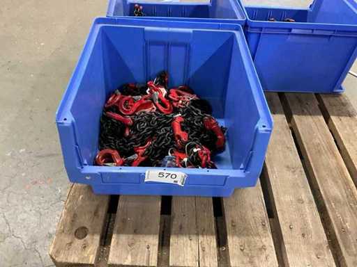 #570# 10 Anschlagketten 6mm Glieder teilweise geprüft in Kunststoffbox - Zustand sauber und technisch einwandfrei