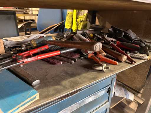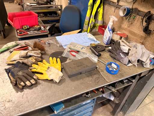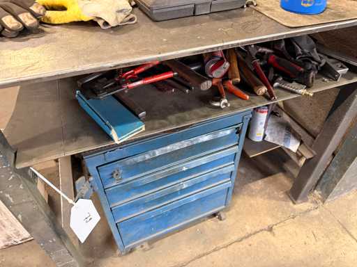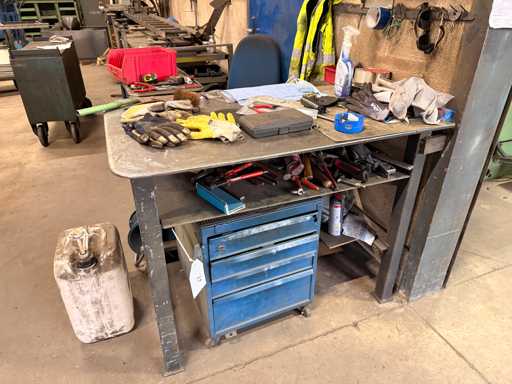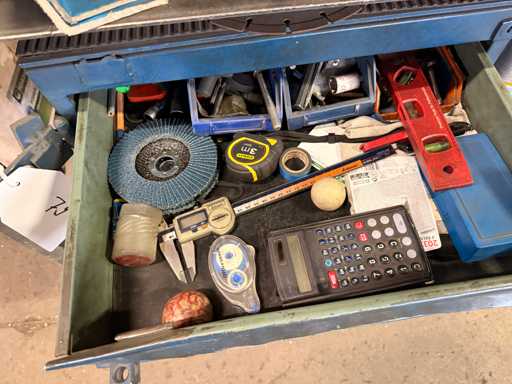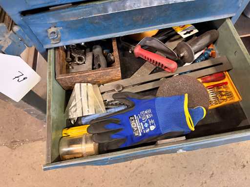 Inhalt bestehend aus diversen Handwerkzeugen, einem Werkstattwagen mit eiem digitalen Messschieber, Schleifscheiben, Akkuschrauber und weiterer Werkstattbedarf