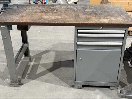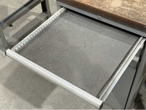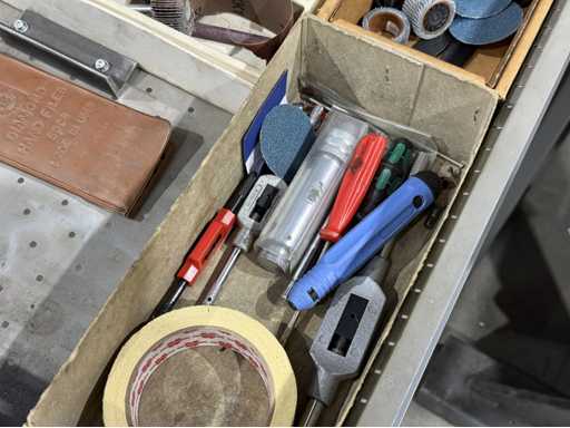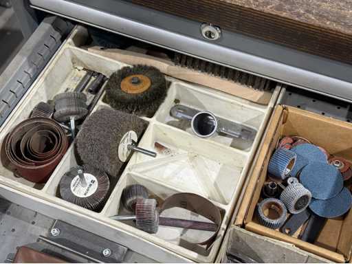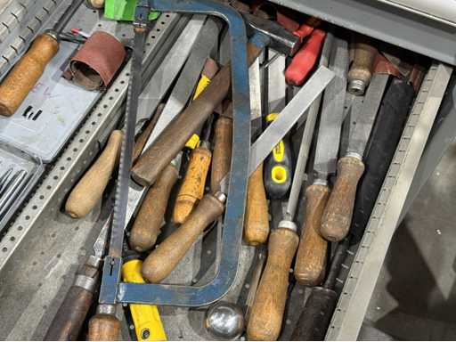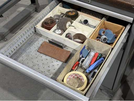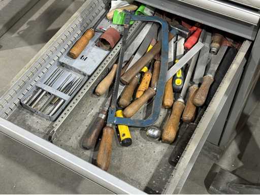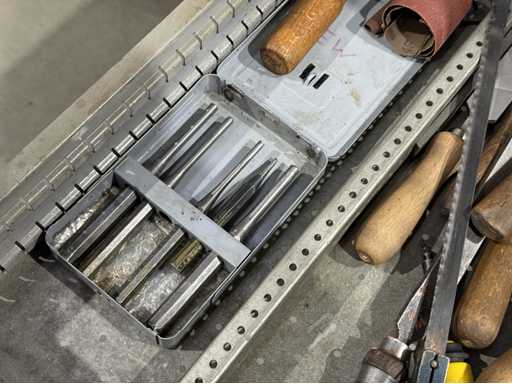Breite der Werkbank ca. 1700mm; bestückt mit Schraubstock; Inhalt: Sortiment an Handwerkzeug,überwiegend Feilen; weitere Details siehe Fotos