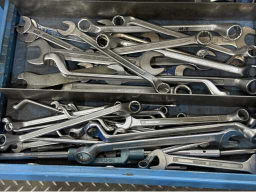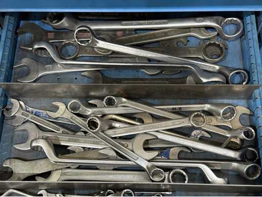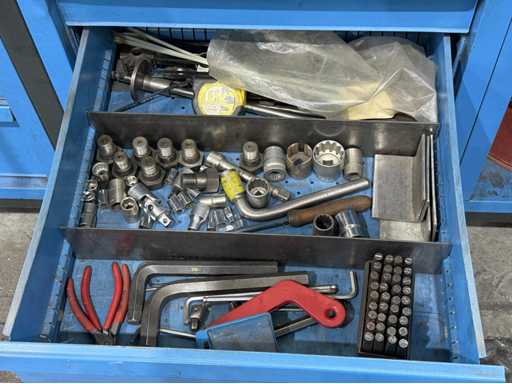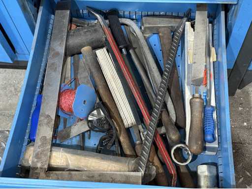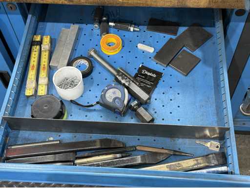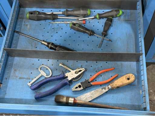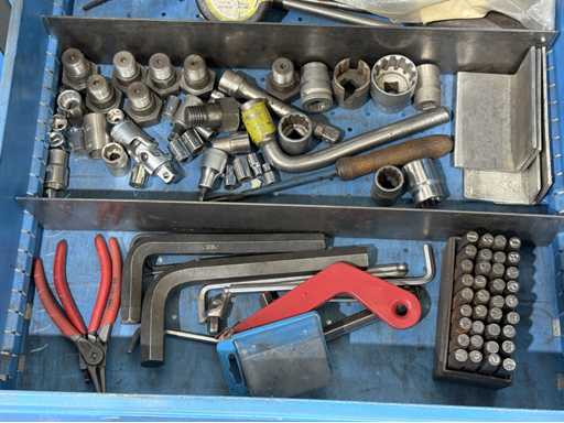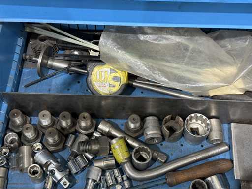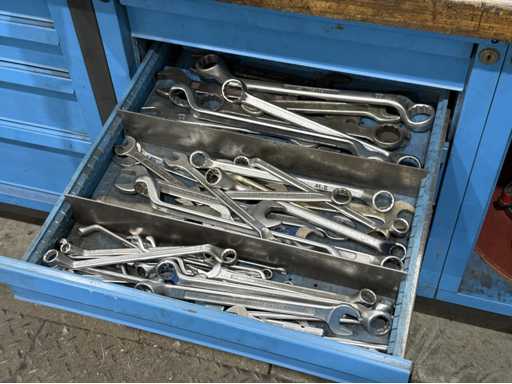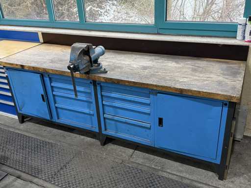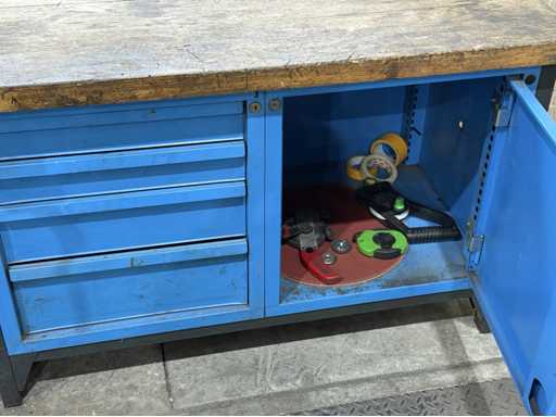 Breite der Werkbank ca. 2500mm;bestückt mit Schraubstock;Inhalt: großes Sortiment an Maulschlüssel,Schraubendreher,Nusseinsätze,Feilen,Schlagzahlen etc.; weitere Details siehe Fotos