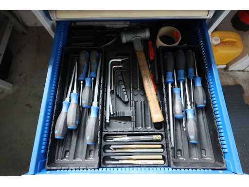 Werktisch mit Inhalt: Schraubenzieher, Schlagbuchstaben, Meißel und etc.