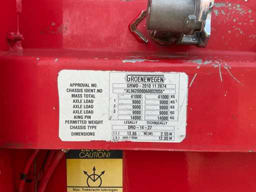 Maximale Masse 41000 kg, Radstand 879 cm; Abstandsmittelkupplung zum Heck des Fahrzeugs 1200 cm, Achse 1 als Hubachse ausgeführt; Ausgestattet mit luftversorgten BPW Eco-Achsen, Aluminium-Bafbells und AMA-Heckhub
