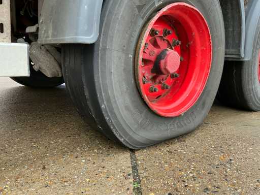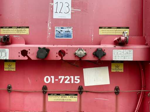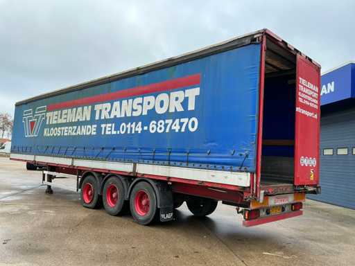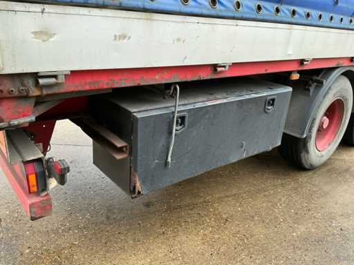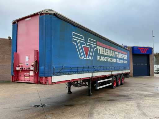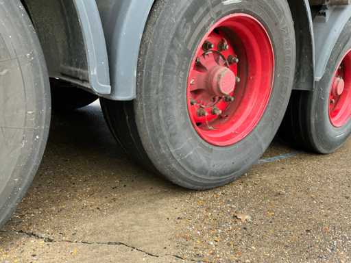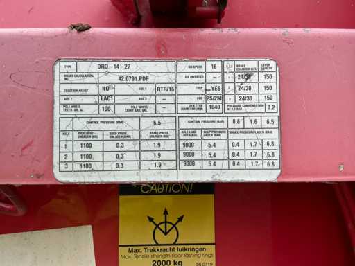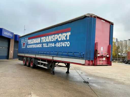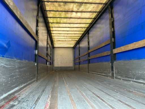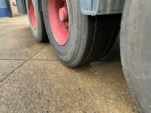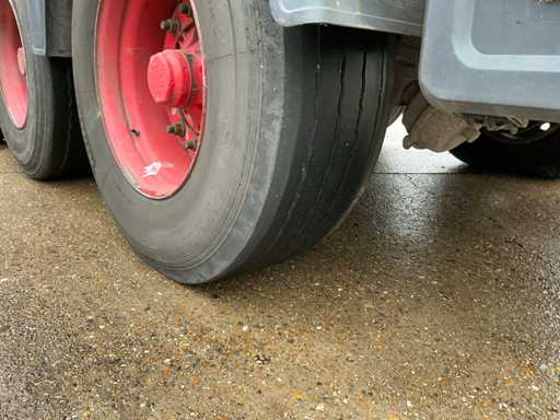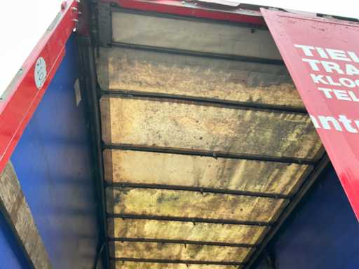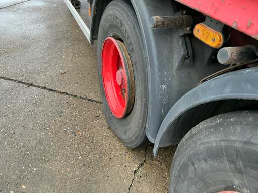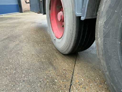 Maximale Masse 41000 kg, Radstand 879 cm; Abstandsmittelkupplung zum Heck des Fahrzeugs 1200 cm, Achse 1 als Hubachse ausgeführt; Ausgestattet mit luftgefederten BPW-Achsen, die erste Achse ist eine Hubachse, Aluminium-Seitenbretter, Vorhänge und Schiebedach, Reifengröße 385/65R22.5, eine Tür fehlt, Reifen sind platt