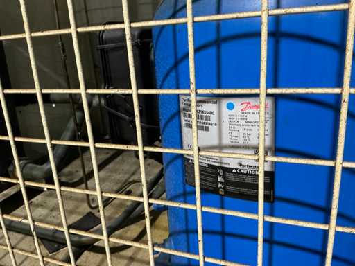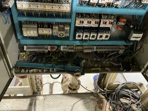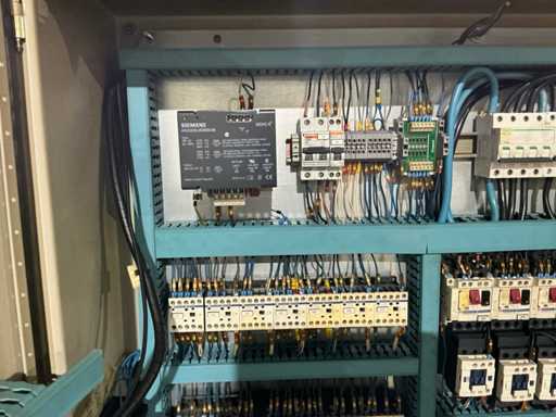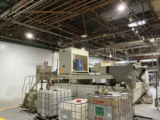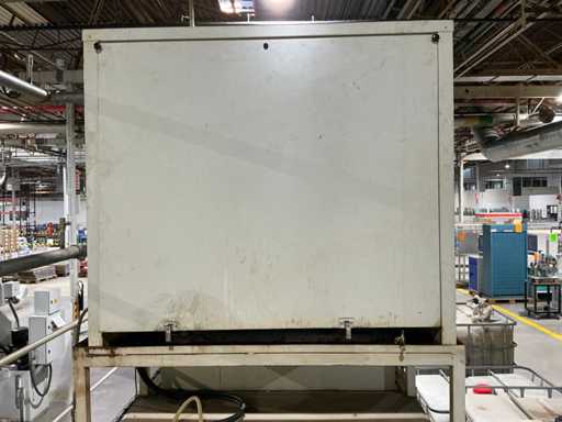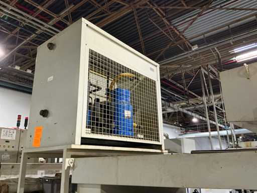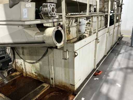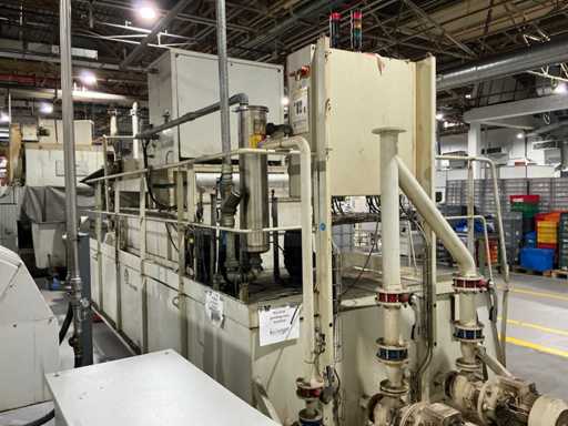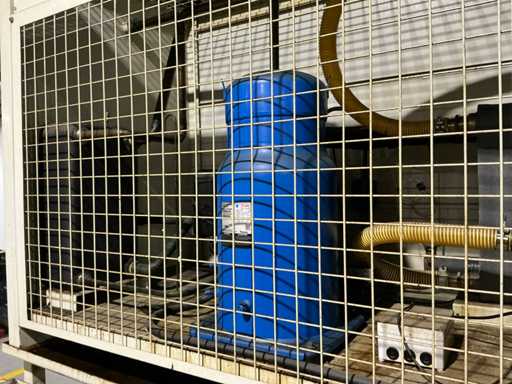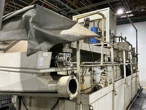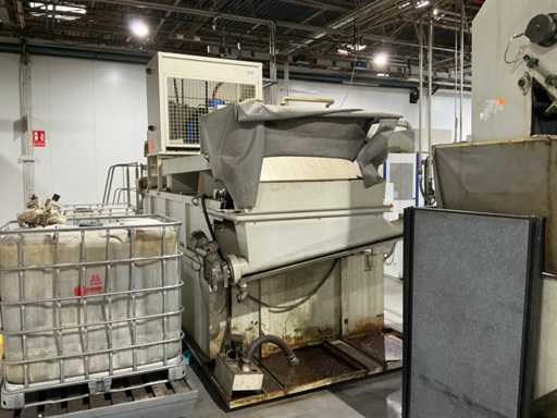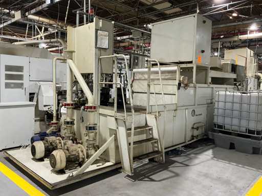 Gravimetrische Filtrationsanlage für die Aufbereitung von Industrieflüssigkeiten (Schneidöle, Emulsionen und Kühlmittel). System mit Filterband/-gewebe, mechanischem Schlammförderer, Umwälzpumpe(n) und integriertem Bedienfeld. Robuste Metallstruktur mit oberer Kühleinheit und Anschlüssen für Entladung und seitliche Wartung.