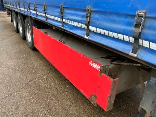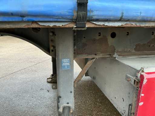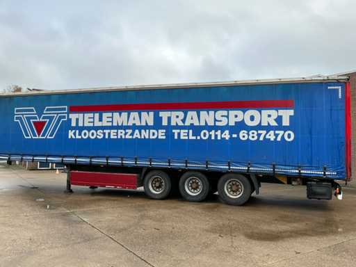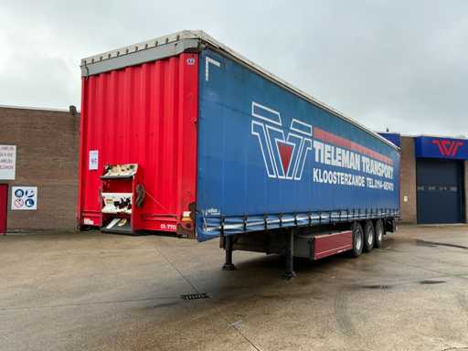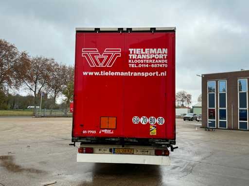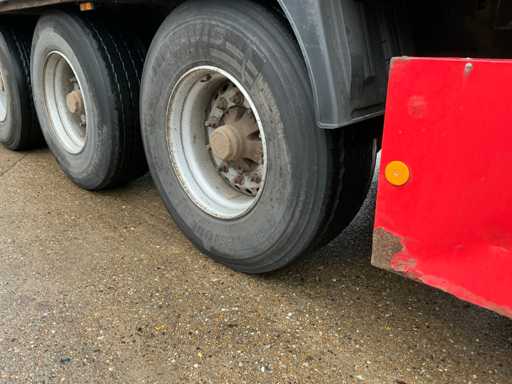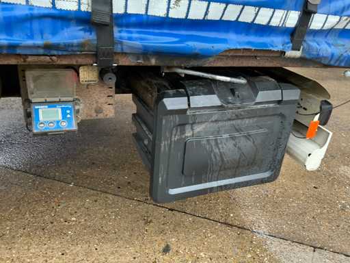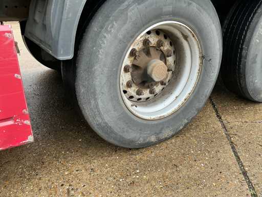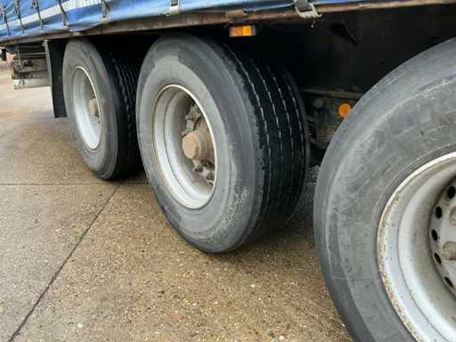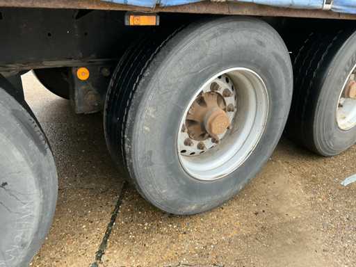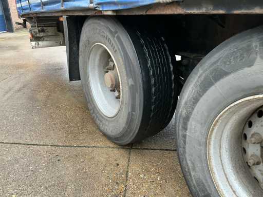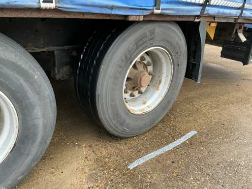 Maximale Masse 41000 kg, Radstand 879 cm, ausgestattet mit luftgefederten BPW-Achsen, Vorhängen, Schiebedach und Palettenkasten, Reifengröße 385/65R22.5, ohne Inhalt