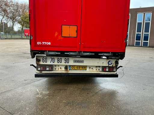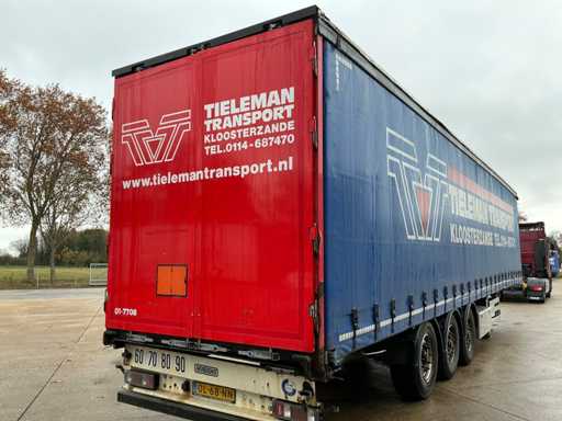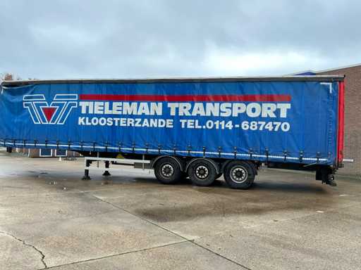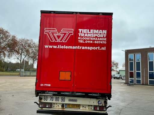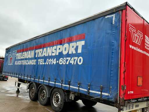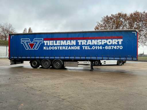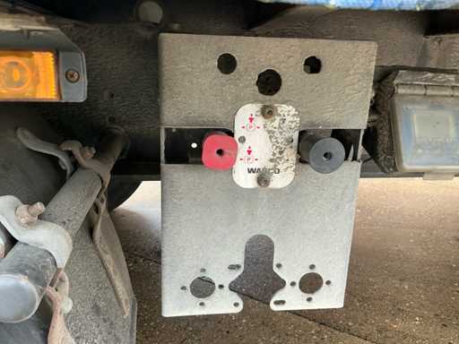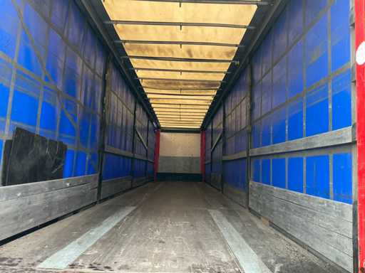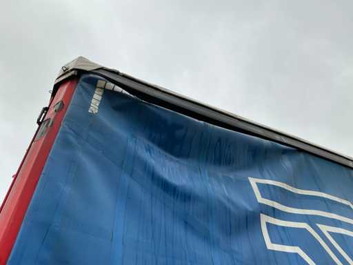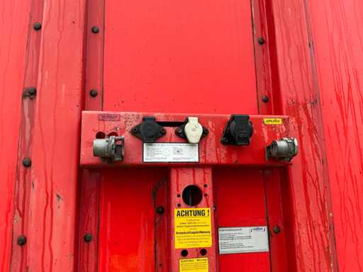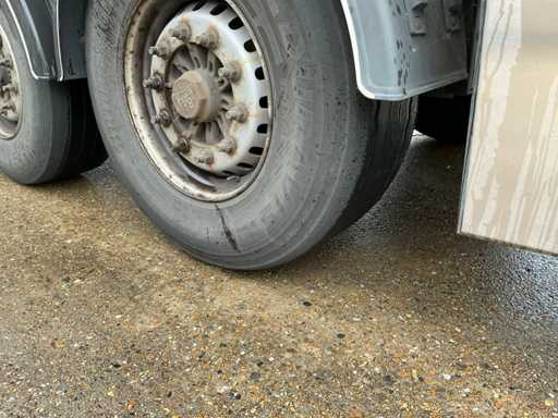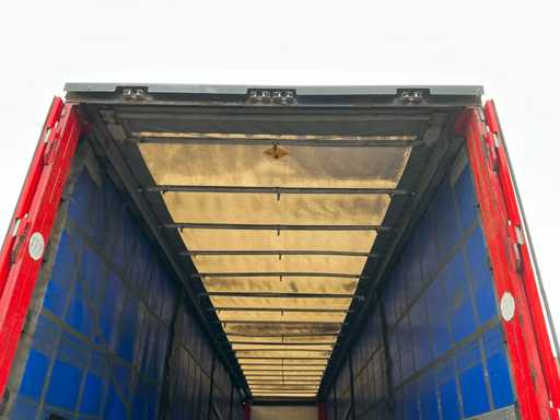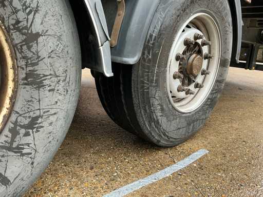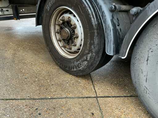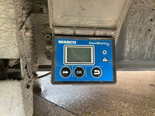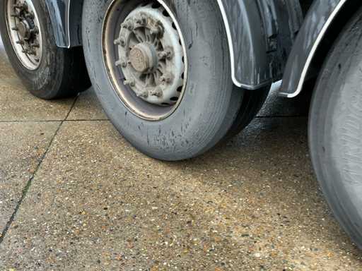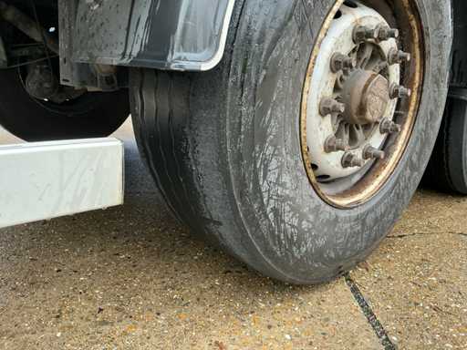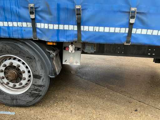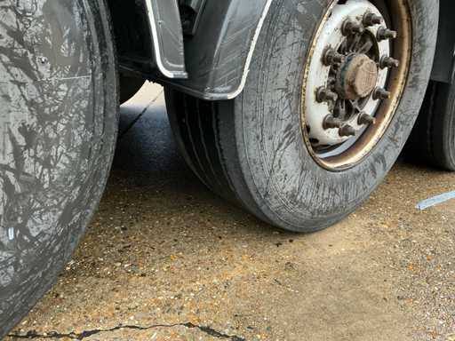 Maximale Masse 43000 kg, Radstand 879 cm, ausgestattet mit Luftfederung BPW-Achsen, Schiebedach und Palettenkasten, Reifengröße 385/65R22.5