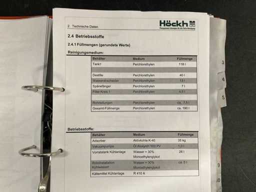 Reinigungsmedium: Perchlorethylen (ca. 190 l Gesamtfüllmenge)Adsorber: Aktivkohle K-40 (35 kg)