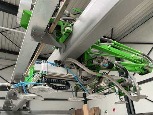 Die Installation ist als Gantry-System (X/Y/Z-Bewegung) konzipiert und mit einem Vakuumhalter mit mehreren Saugnäpfen ausgestattet, geeignet für die Handhabung von Holz, MDF, HPL und Kunststofffolien, unter anderem.