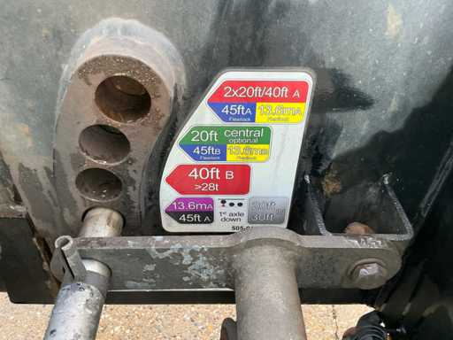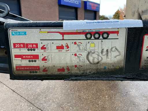 Container 20", 40" und 40" HQ; Maximale Masse: 43.000 kg. Länge: 1132–1434 cm; Radstand: 740–993 cm, Länge: 943–1401 cm, Abstandsmittelkupplung zum Heck des Fahrzeugs: 816–1200 cm, ausgestattet mit Luftfederungsachsen, 1. Achse ist Liftachse, Reifengröße 385/65R22,5