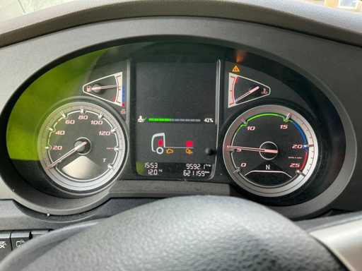 Zulässige maximale Masse 19.500 kg, technische Maximalmasse 20.500 kg, maximale Massemontage 50.000, maximale Masse-Sattelauflieger 4.1949 kg. Ausgestattet mit LAN-Austrittswarnung, Klimaanlage/Klimaanlage, Parkheizung, President Johnson II 27mc., Hinterachse mit Luftfederung, TPM-Ausfall, Schäden an der rechten Vorderseite