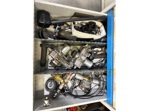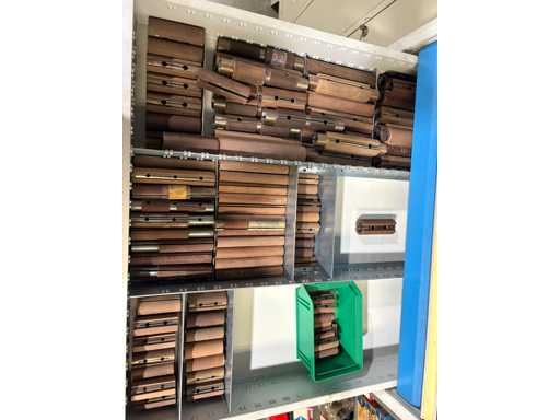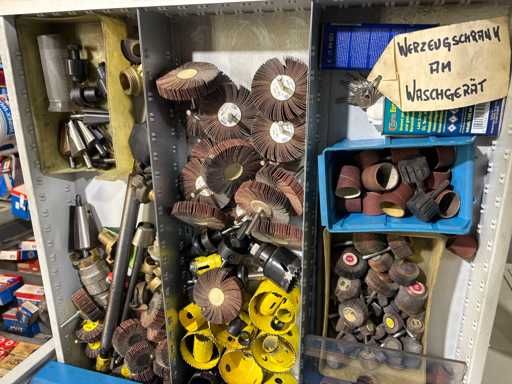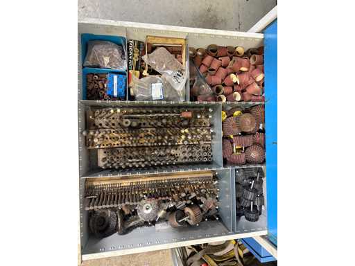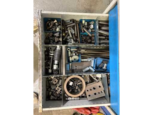 2x Industrie-Schubladenschränke mit umfangreichem Maschinenbau-Zubehör, Spannmittel, Werkzeugaufnahmen und Schleifmitteln und 6x Kleinteilemagazine / Sortimentskästen