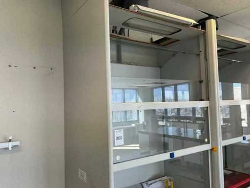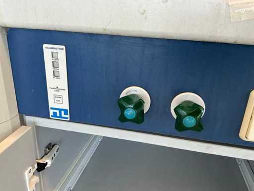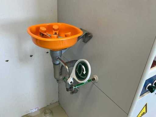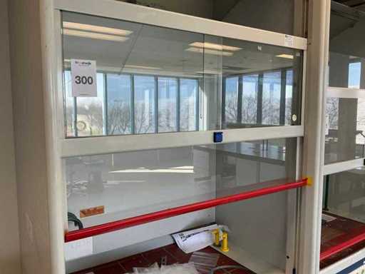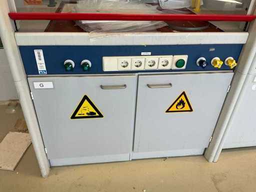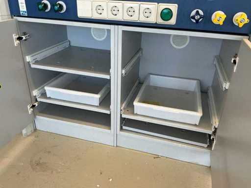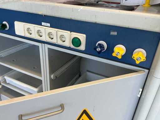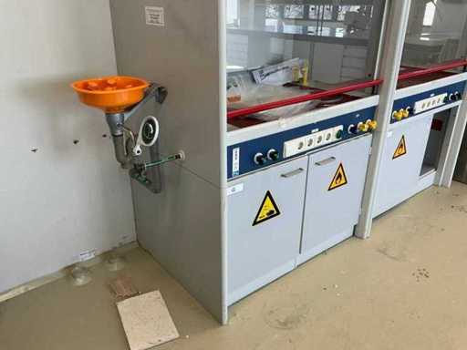 Ausgestattet mit Glasschiebefenster, zwei Schwingtüren mit Schubladen, Augendusche.