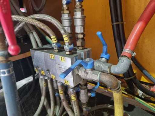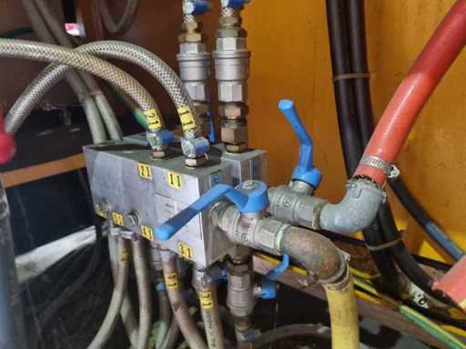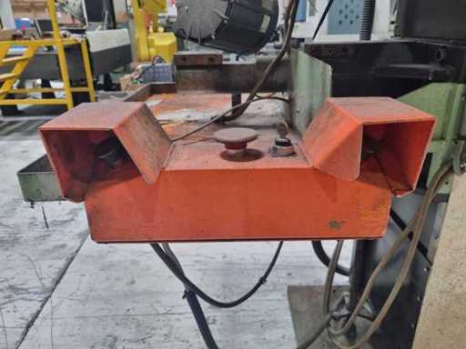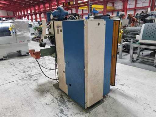 Industrie-Punktschweißer für Widerstandsschweißarbeiten an Metallteilen. Die Maschine ist mit verstellbaren Armen ausgestattet, die eine Anpassung an verschiedene Teilkonfigurationen ermöglichen. Pneumatischer Betrieb mit Wasserkühlung.