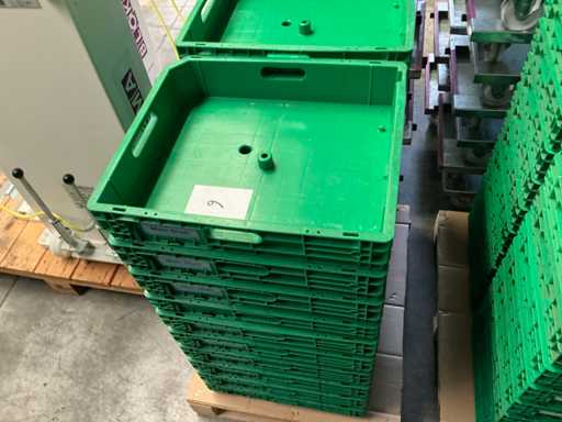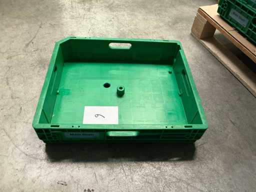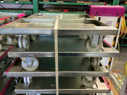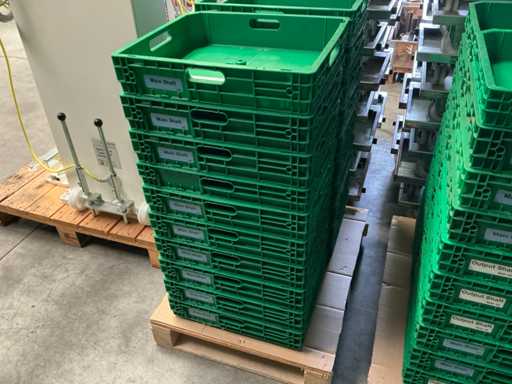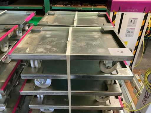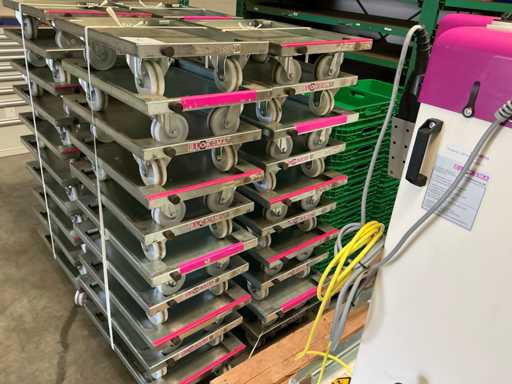 Hebehöhe: 850 mm; Enthält: 20 passende Dollies mit einem Fassungsvermögen von 150 kg, Abmessungen: 600x400x160mm Artikelnummer: Z201357; darunter 20 stapelbare Plastikkörbe. Größe: 445x380mm