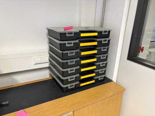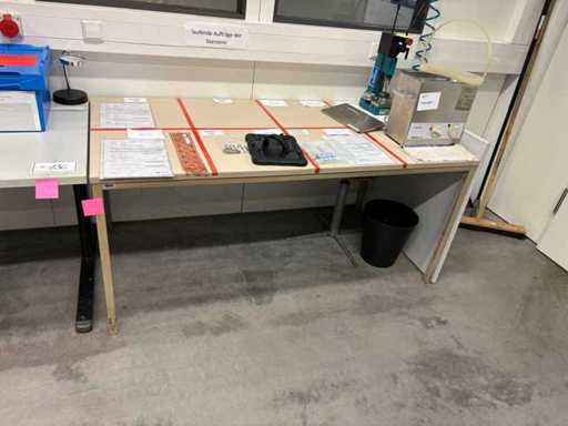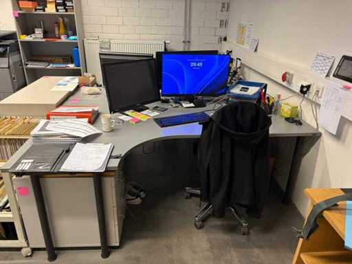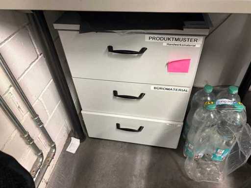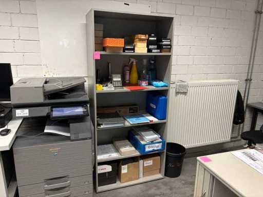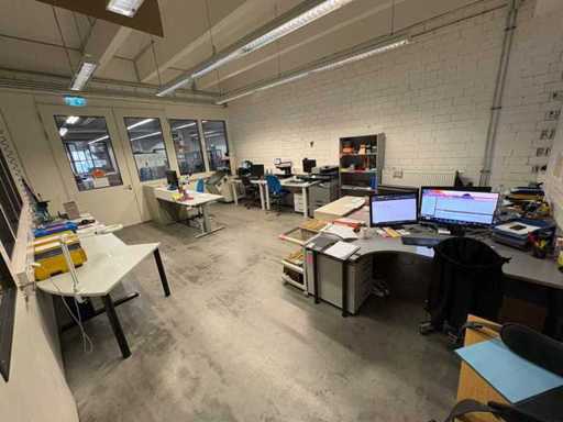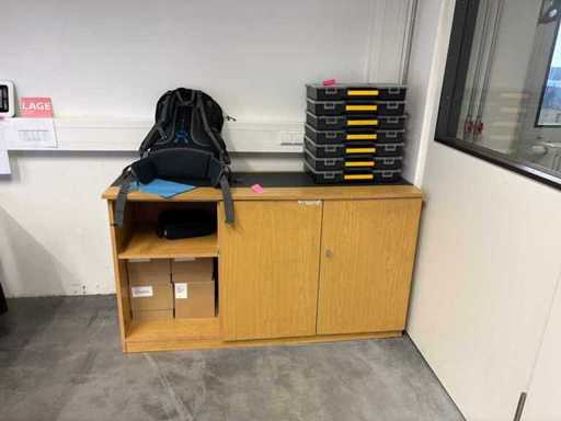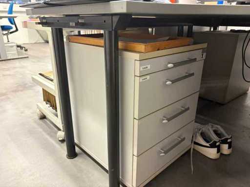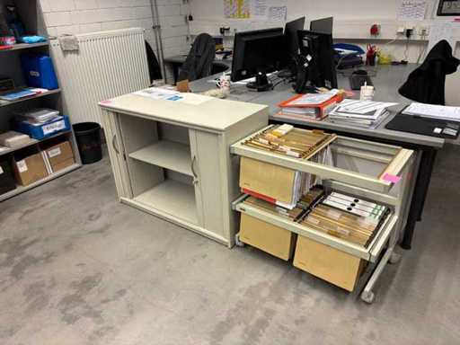 Bestehend aus: u.a. 6 Arbeitstischen, 2 Sideboard, 3 Rollcontainer, 1 Registerrollwagen, 1 Regal, ohne Inhalt