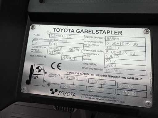Toyota Gabelstapler 02-8FGF15 - Baujahr 2017 - 1.500 kg - 4,5 m Hubhöhe - Seitenschieber
